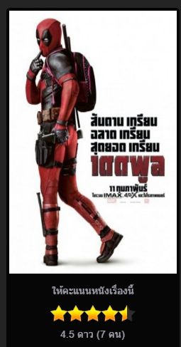 ตอนนี้ สมาชิกพันทิป 7 ท่าน ให้คะแนน Deadpool เฉลี่ยรวมกัน 4.5/5 ดาวครับ