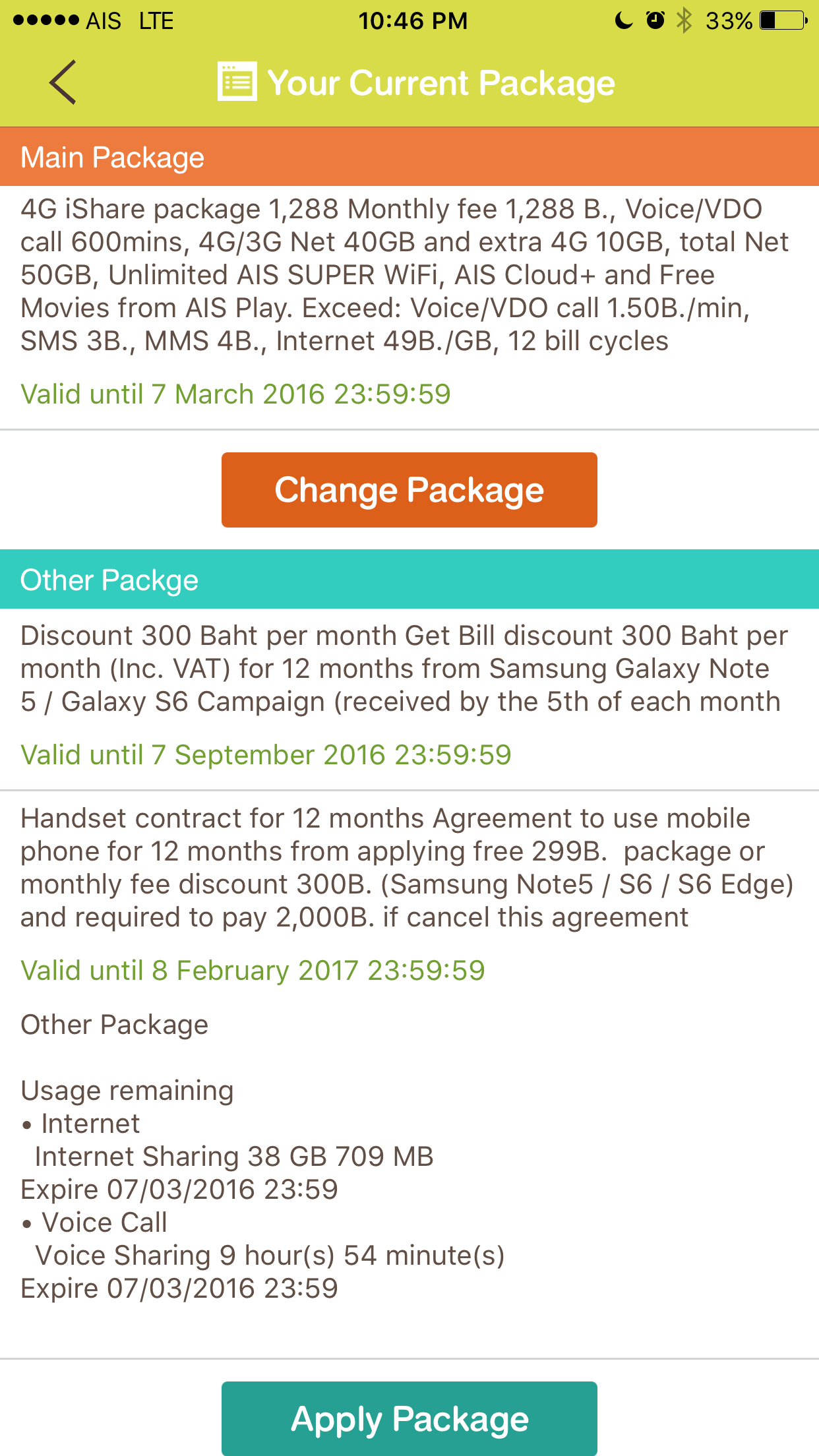หมายเลขของผม เคยนำไปร่วมโครงการรับส่วนลดรอบบิลละ 300 บาท จำนวน 12 รอบบิลจากการซื้อ Galaxy Note 5 ซึ่งจะหมดสัญญาในเดือน กย. ปีนี้ ตรงนี้ผมเข้าไปดำเนินการด้วยตนเอง ทราบว่ามีสัญญานี้แน่นอน