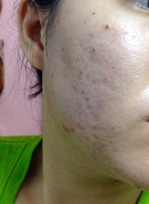 สภาพผิวโดยปกติสิวส่วนใหญ่เป็นสิวอุดตัน มีอักเสบบ้างนิดหน่อย รอยแดงรอยดำและหลุมเยอะ