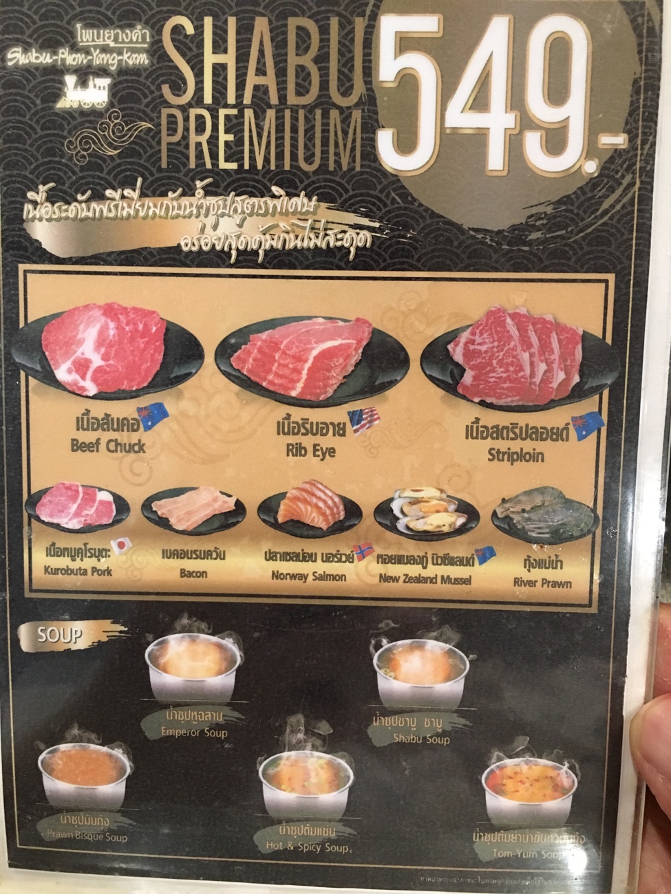 ราคา 549 นี่ไม่รวมเครื่องดื่มนะ เนื้อนำเข้า? กุ้งแม่น้ำ? หึหึ
