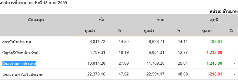 Sinthorn Summary 18/2/2559 : ต่างชาติซื้อสุทธิ 1,245.00 ลบ.