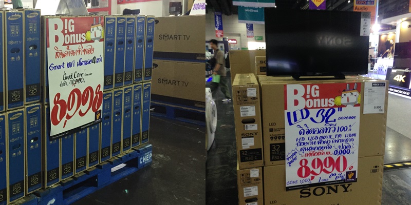 โปรฯ เริ่มกันที่ทีวีก่อนเลยละกันครับ คนงบหนาอย่างผมขอพุ่งเข้าไปที่กองโละราคาก่อนเลย (ก็ราคามันยั่วใจ) ซัมซุงแพงกว่า 8 บาท แต่เป็น Smart TV น่าสนใจกว่า Sony ขึ้นมาเยอะเลย ถือว่าราคาสบายกระเป๋าสำหรับไซต์นี้