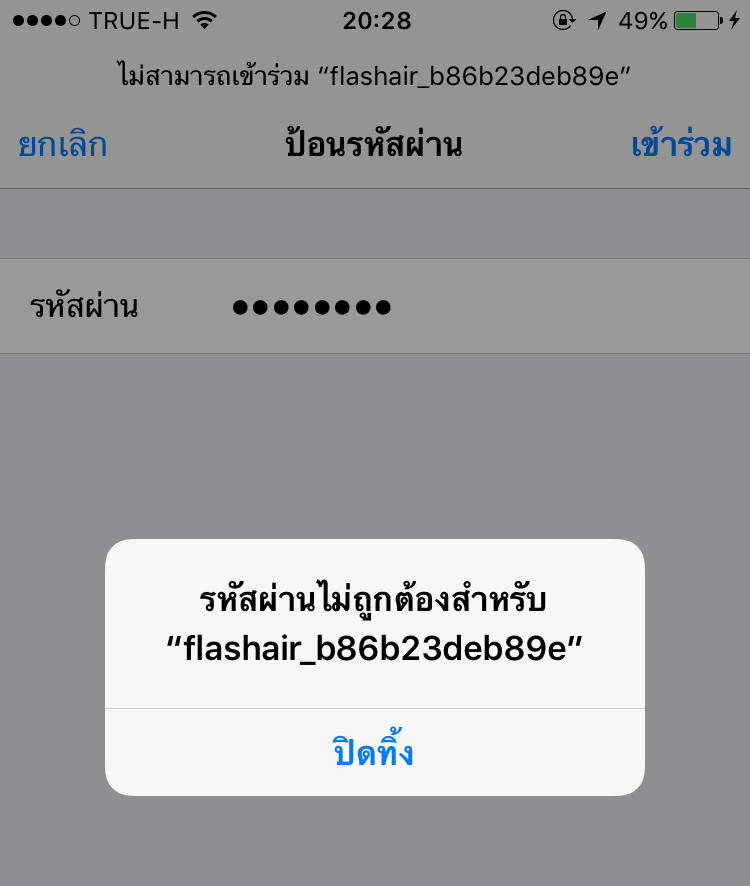 ตอนนี้ปัญหาที่เกิดขึ้น คือ สามารถจับสัญญาณเจอ ชื่อflashair แต่ไม่สามารถเชื่อมต่อสัญญาณได้ค่ะ จะเด้งให้ใส่ password ตลอด ใส่แล้วยังเชื่อมต่อ ไม่ได้เหมือนเดิม (ลบ app แล้วโหลดใหม่แล้วค่ะ)
