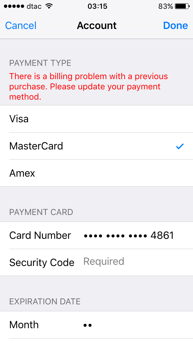 iphone5s ios9.2.1ค่ะ ปกติก็อัพเดทได้ปกติ อยู่ๆก็กดอัพเดทแอพไม่ได้เลย มันจะขึ้นมาหน้าข้อมูลจ่ายเงินตลอด ทั้งๆที่ไม่ต้องใช้บัตร