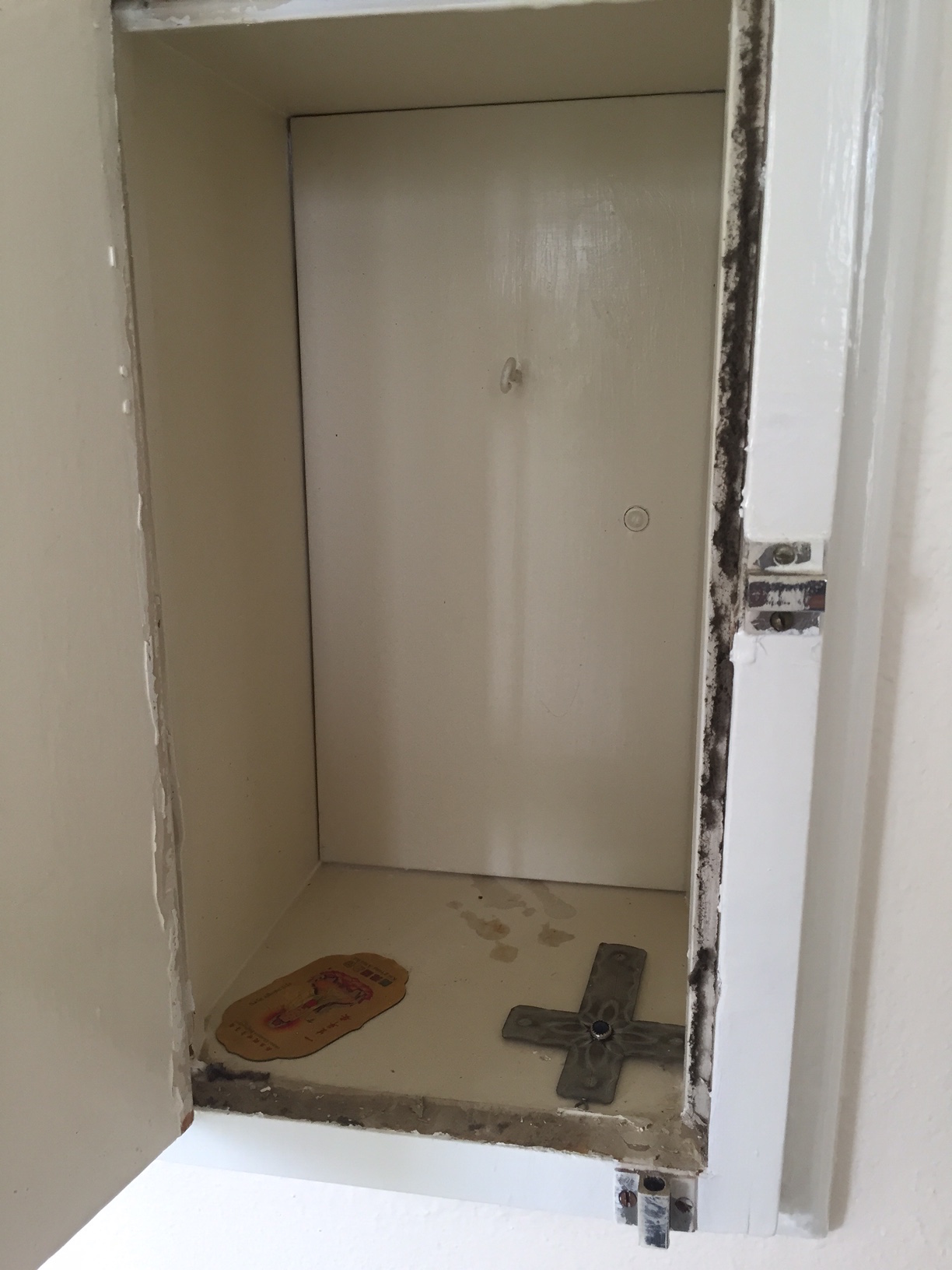 พอเมื่อวานค่ะเราเข้าไปเช็คห้องอีกที เราดันไปเจอสิ่งๆนี้ค่ะตามรูป เราช็อคคคคคค เรียกแฟนมาดู แฟนบอกว่าไม้กางเขนเหมือนเป็นของฝาก คือบอกตรงๆว่าตอนนั้นและตอนนี้เราคิดไปหมดทุกอย่างค่ะว่าห้องนี้มีผีหรือมีอะไรแน่ๆไม่งั้นของสองสิ่งนี้จะมาวางอยู่ได้อย่างไร คิดไปต่างๆนาๆ ซึ่งก่อนหน้านี้ที่เราเข้าไปดูบ้านก่อนเซ็นสัญญาเราก็เห็นค่ะว่ามันมีเหมือนจะเป็นตู้จดหมายเล็กๆอยู่ใกล้ๆกับประตูห้อง โดยที่จะมีกลอนล็อคอยู่แต่เราก็ไม่ได้เปิดดูค่ะเพราะคิดว่าอาจจะเป็นเมนบอร์ดของสวิตไฟก็ได้ก็เลยไม่ได้สนใจอะไร