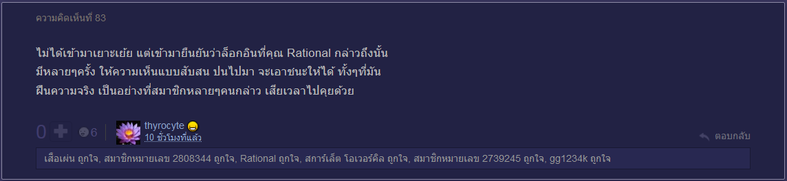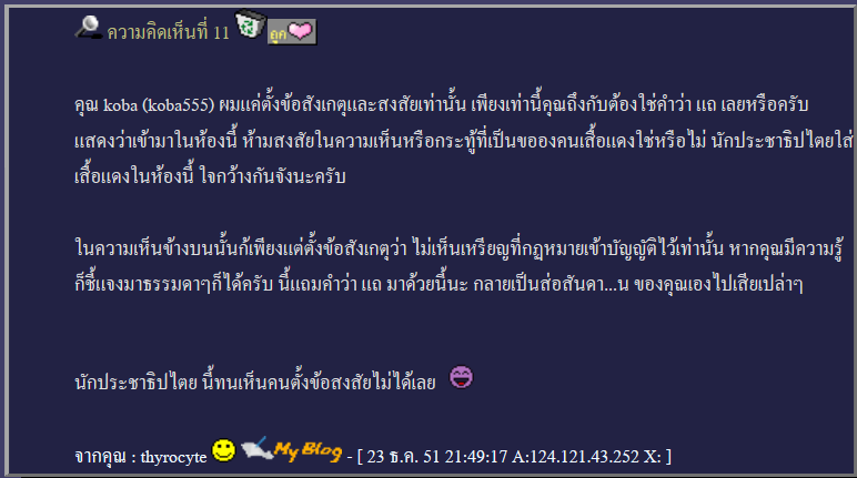 ช่วงนี้เห็นกระทู้พูดถึงคุณ thyrocyte กันหลายกระทู้ บางกระทู้ก็พูดในทำนองเป็นพวกเสื้อแดงที่ทำเนียนกลายเป็นเสื้อเหลืองบ้าง บางกระทู้ก็กล่าวหาเป็น login ปลอมบ้าง สำหรับ login ปลอม คงไม่จำเป็นต้องไปกล่า