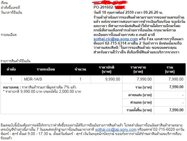 รุ่งขึ้นทาง Sony ส่งเมลล์มายืนยันออเดอร์ แล้วผมก็กดจ่ายเงินผ่านบัตรเครดิตทันที (18 Feb 2016)