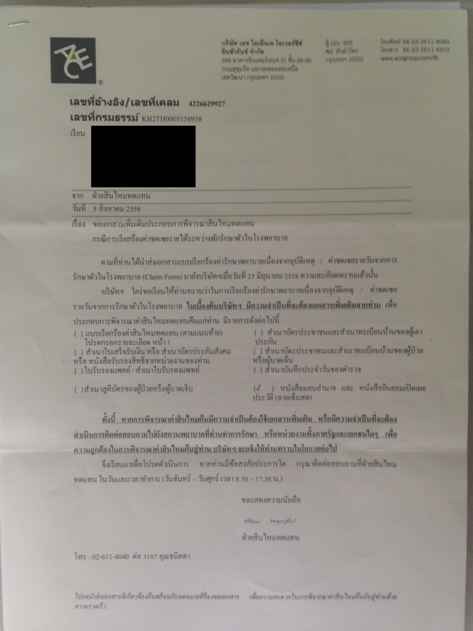 -    วันที่ 8 สิงหาคม 2558 ทางบริษัท ACE โดยฝ่ายสินไหมทดแทนได้ส่งเอกสารมาขอเอกสารเพิ่มเติม (เช่น หนังสือยอมเปิดเผยประวัติ)