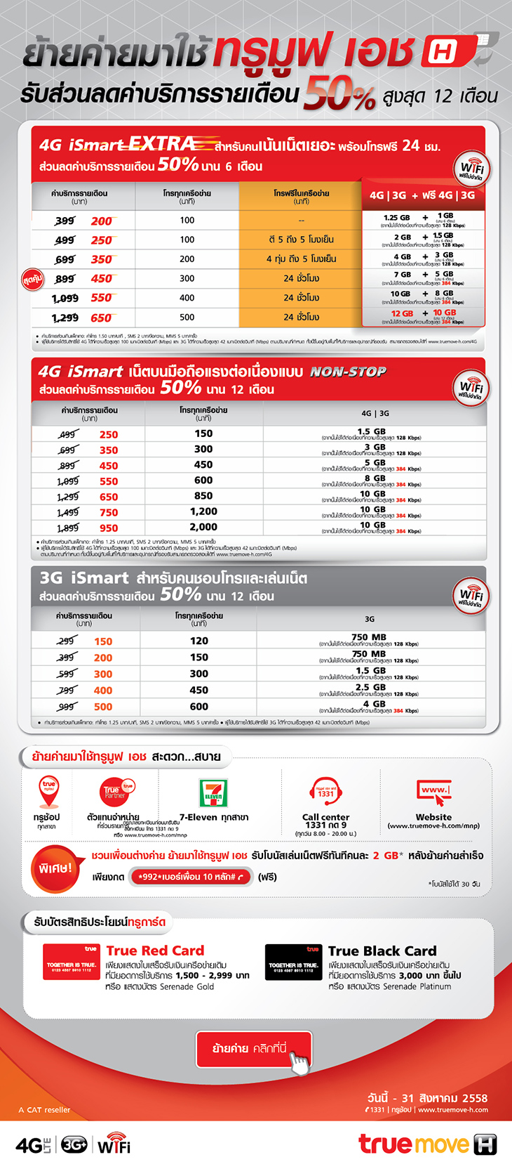 เห็นลิ้งค์เสนอโปรย้ายค่ายจากกระทู้นึง http://truemoveh.truecorp.co.th/mnp/mnp_method/entry/3705 โปร 4G iSmart Extra สนใจโปร 899฿ ลด50% เหลือ450฿ โทรฟรีในเครือ เนต7GB+5GB หรืออีกสองค่ายมีโปรที่คล้าย