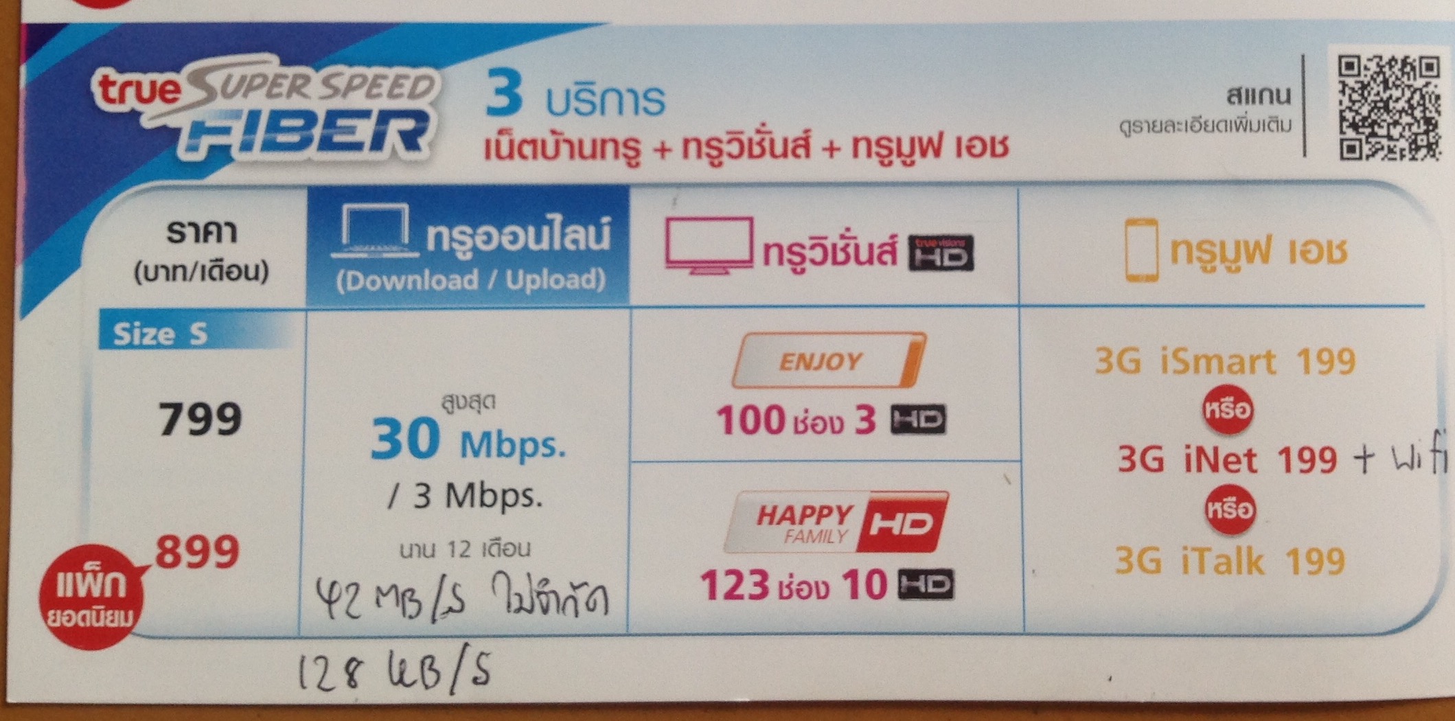สมัครแบบ size S 799 บาทต่อเดือน เป็นค่าใช้จ่ายที่รวม 3 บริการคือเน็ตบ้าน /ทรูวิชั่นส์ 100 ช่อง /และเราเลือก ทรูมูฟเอชเป็น 3g inet 199