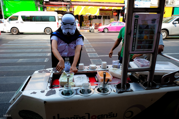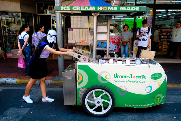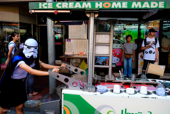...ลงมาเจอรถไอติมก็ไปแย่งคนขายเข็นรถแล้วก็ตักของเขาเฉยเลย