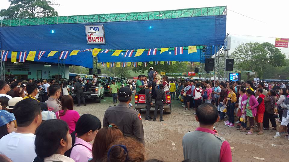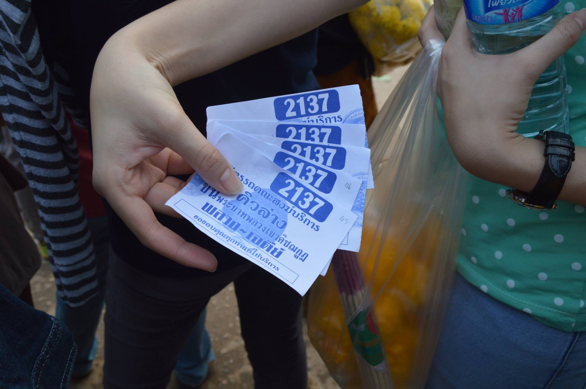 จขกท.และเพื่อนๆ ตัดสินใจไปขึ้นรถที่วัดพลวง แต่รถก็ติดมากๆ จริงๆ เนื่องจากเป็นวันหยุดใกล้วันพระใหญ่ด้วยแหละ ก็เลยจอดรถไว้แถวหน้าร้านขายของชำ (ขอบคุณมากเลยค่ะลุงกับป้าใจดีมาก) แล้วก็เดินเท้าต่อไปอีกสักพัก ประมาณ 45 นาที ก็มาถึงวัดพลวงประมาณ 7 โมงกว่าๆ ค่ะ ในขณะที่กำลังมองหาว่าตั๋วขายอยู่หนใด...ก็เดินไปเจอกับแก๊งบ่าวสวยเสื้อดำ ถามพวกเราว่า “มากันห้าคนรึป่าว” ตอบว่า ใช่ค่ะ แก๊งบ่าวสวยเสื้อดำเค้าบอกว่า มาถึงกันตั้งแต่ตีสาม แต่รอไม่ไหวแล้ว ก็เลยให้ตั๋วพวกเราฟรีๆ เลย แล้วก็อนุโมทนาบุญด้วยค่ะ (ขอบคุณมากมายนะคะ ^^) ได้เป็นตั๋วใบขาวค่ะ