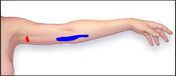 แต่ปวดตรงบริเวณสีน้ำเงินแทน แบบยืดแขนตึงแล้วปวดน่ะค่ะ
