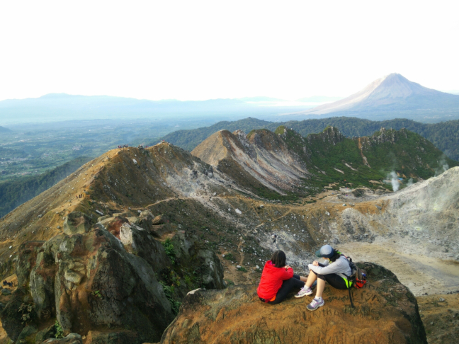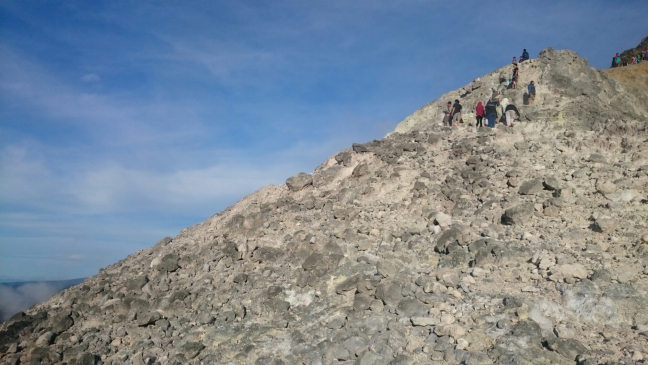 พระอาทิตย์เริ่มส่องแสงสัญญานของวันใหม่ แสงแดดสาดส่องไปทั่วภูเขาไฟซิบายัค เราจึงได้สังเกตุเห็นว่า ไม่เพียงแต่ยอดที่เรายืนอยู่นั้น อีกสองยอดก็คราคร่ำไปด้วยนักท่องเที่ยวด้วยเช่นกัน