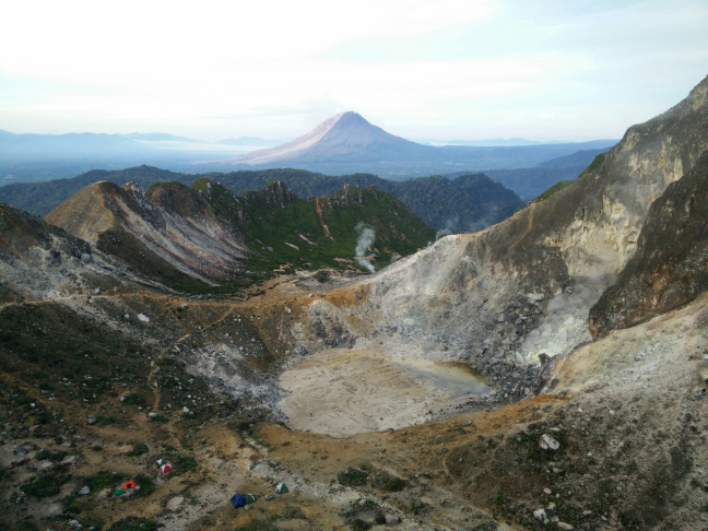 ปากปล่องซิบายัค มีซินาบุงตะหง่านอยู่ด้านหลัง