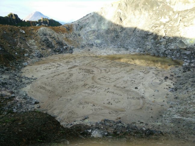 พื้นปากปล่องภูเขาไฟเต็มไปด้วยก้อนหินน้อยใหญ่ มีนักท่องเที่ยวนำมาจัดวางเป็นตัวอักษร(เดาว่าเป็นชื่อตัวเอง) พอมองใกล้ ๆ ถึงได้รู้ว่าก้อนใหญ่พอดู น่านับถือในความพยายาม (แต่ผมว่าปล่อยไปตามธรรมชาติจะสวยกว่านะ)