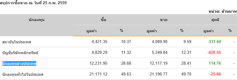 Sinthorn Summary 25/2/2559 : ต่างชาติซื้อสุทธิ 114.76 ลบ.