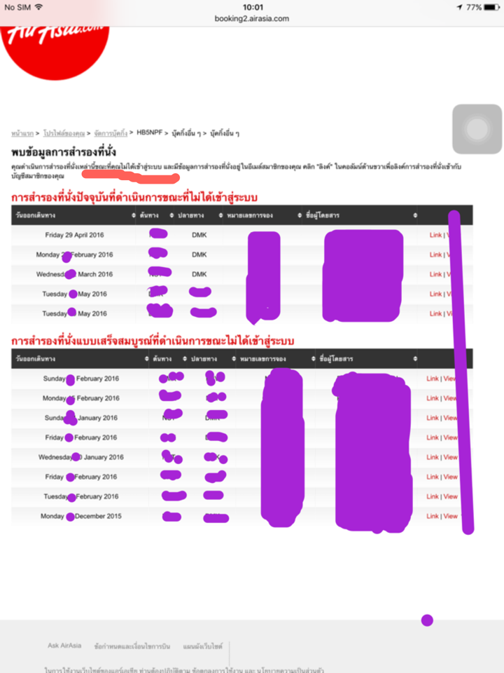อันนี้ เป็นรูป ที่จองผ่านแอป log in เข้าสู่ระบบเรียบร้อย ใส่ E mail ใส่ big ID ทำตามขั้นตอนทุกอย่าง กรอกทุกช่อง อันนี้เป็นการจองล่าสุดของเรา 23/02/59 ค่ะ เดินทาง 29/04/59 คือ จากที่พลาดมาหลายรอบเลยลองจองใหม่ แล้วสังเกตุว่าทำขั้นตอนไหนผิดไปบ้าง พอจองพร้อมชำระเงินทั้งหมดเสร็จเรียบร้อย เราก็เข้าไปเช็คใน เวปไซค์ ของแอร์เอเชีย พร้อมกับ log in เข้าสู่ระบบ แล้วกลับพบว่า การจองของเรากลายเป็นการจองที่ไม่ได้เข้าสู่ระบบ ตามรูปนะคะ 29/04/59 ที่เพิ่งจอง