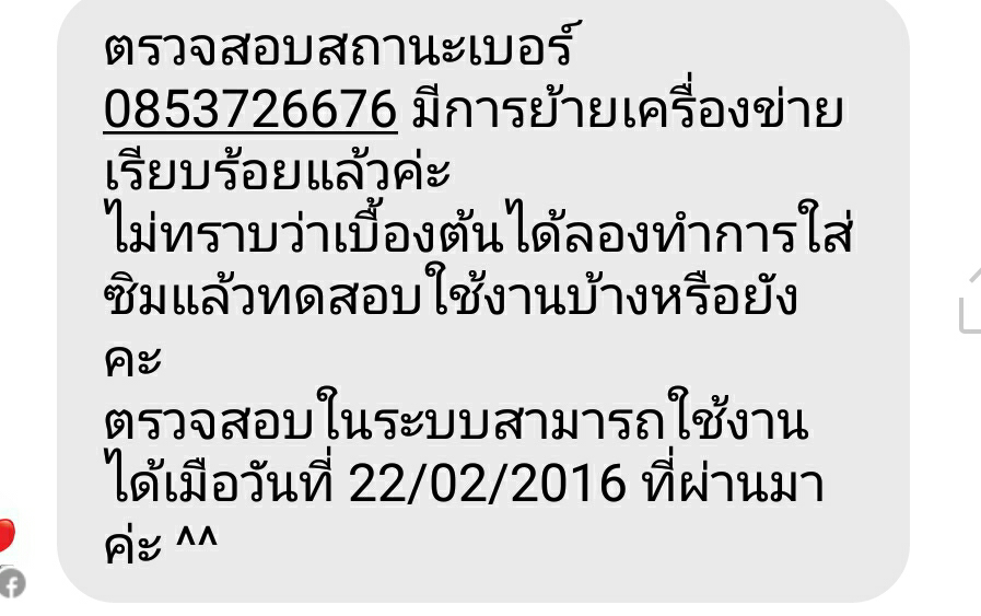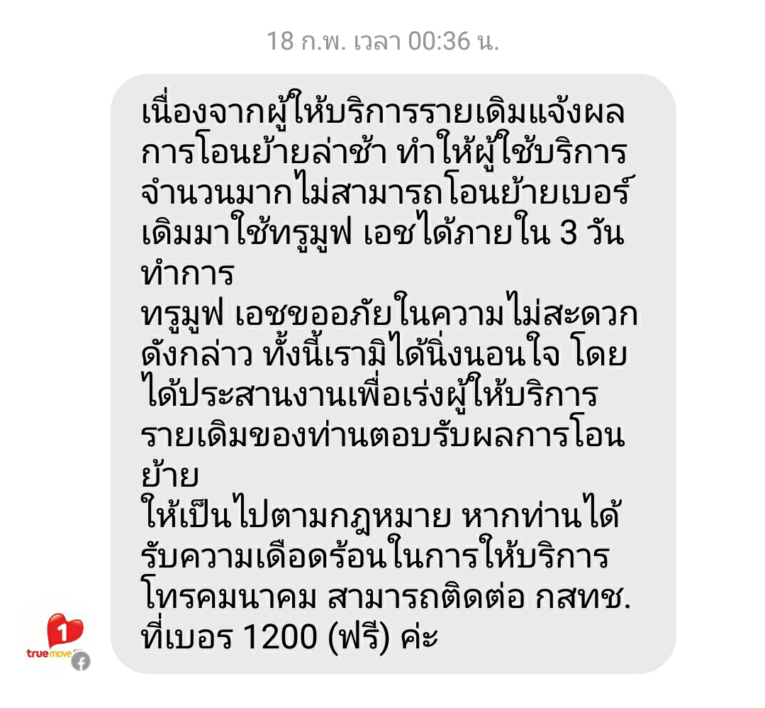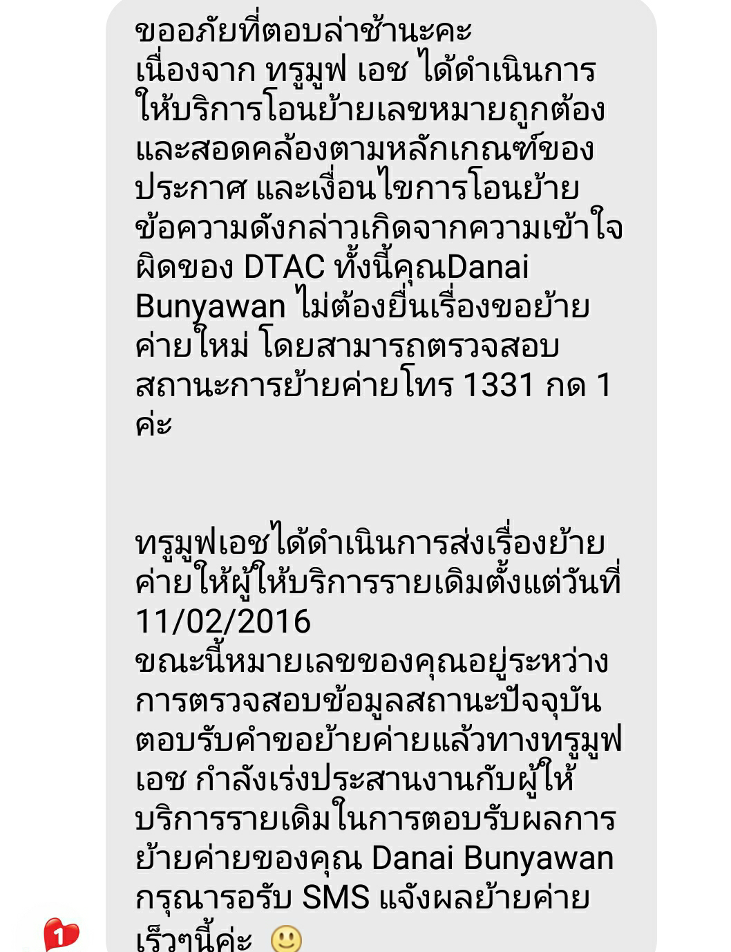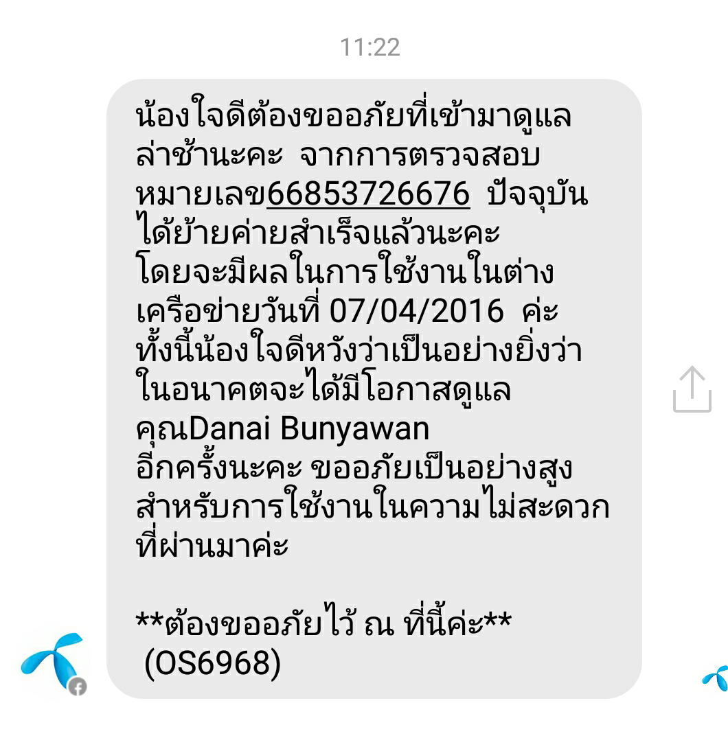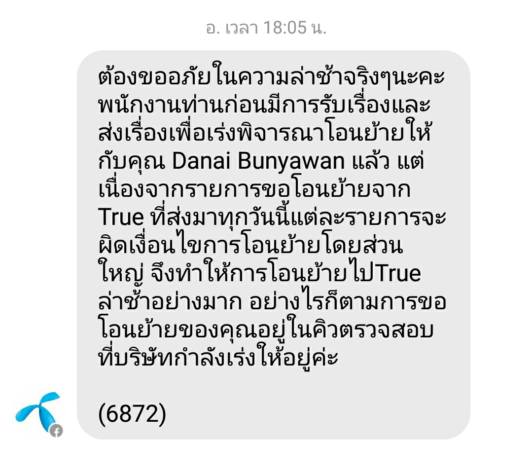 คือผมจะย้ายค่ายจากดีแทคไปทรู ผมจึงไปย้ายที่ 7 -11 ในวันพุธที่10 ก.พ. แล้วพนักงานก็บอกว่าให้ซิมถูกตัดสัญญาณก่อน แล้วใส่ซิมใหม่ซึ่งใช้เวลาประมาณ3-5 วัน ผมก็รอๆๆๆ จนสัปดาห็กว่าเลยสอบถามไปทางเพจ ของทรู ว่าทำไมยถึงยังย้ายค่ายไม่ได้ ทรูก็ตอบมาว่า"เกิดความล่าช้ามาจากทางดีแทค"