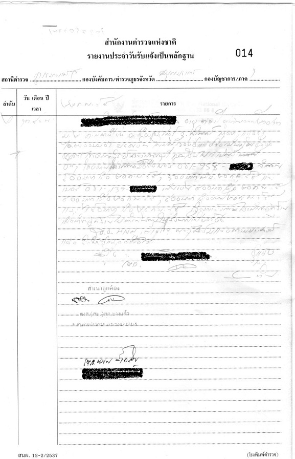 ต่อมาเวลา 13:00 ได้ไป สน.บางแก้ว และพบร้อยเวรและเล่าเรื่องให้ตำรวจฟัง ตำรวจยังหัวเราะและตกใจว่ามันเป็นไปได้หรอกับการโดนถอนเงินด้วยวิธีนี้ ทำได้ด้วยหรอ และลงใบแจ้งความ และเอาใบนี้ไป ธนาคารสีม่วง สาขาเมกกะบางนา เวลา 14:30 โดยประมาณ ให้กับทางธนาคารและถามธนาคารว่ามีการเบิกเงินวิธีนี้ด้วยหรอ ธนาคารตรวจสอบว่ามีบริการเสริมหรือไม่ ซึ่งตรวจสอบแล้วไม่มีการเปิดบริการลักษณะนี้