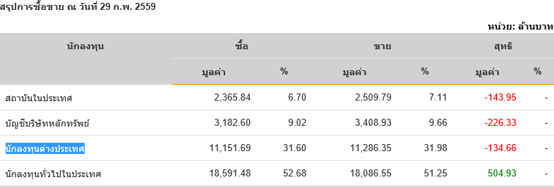 Sinthorn Summary 29/2/2559 : ต่างชาติขายสุทธิ -134.66 ลบ.