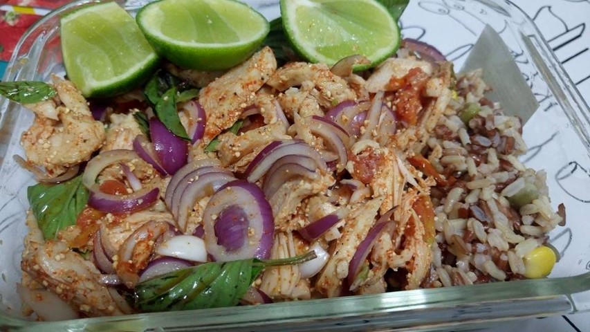 หากเบื่อไก่อบเพียวๆ ก็เอามาทำข้าวยำไก่แซบซะ หั่นเป็นชิ้น คลุกกับพริกป่น บีบมะนาวใส่นิสหน่อย