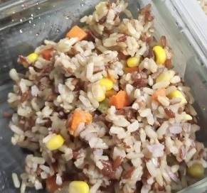 โดยเมนูที่ทำ จะทานกับข้าวกล้อง2สี (เรียนไม่ถูกเหมือนกัน ว่าชนิดไหน) หุงรวมกับผัก3สี