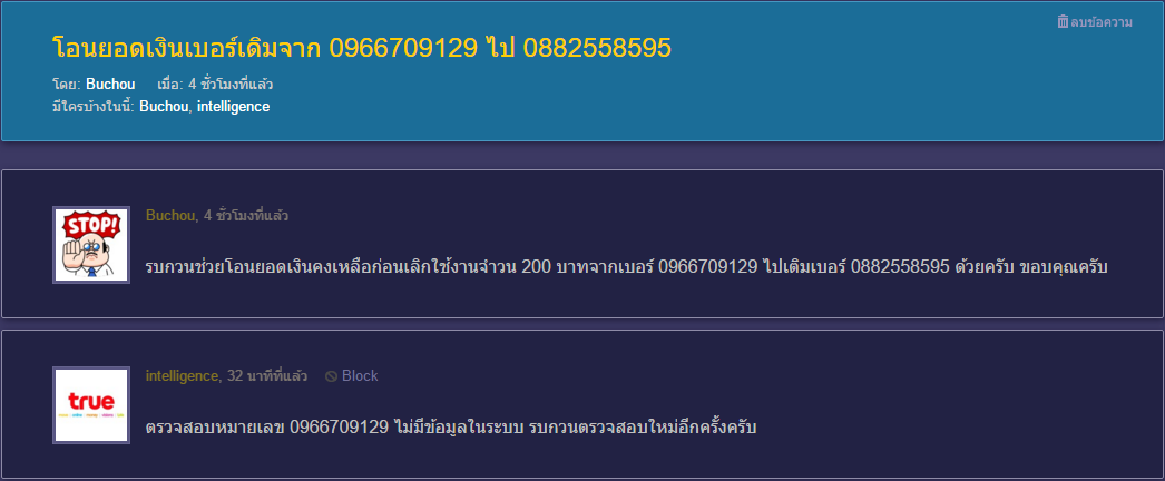 ก่อนหน้านี้ผมใช้เครือข่าย True แบบเติมเงิน มีเงินเหลืออยู่ 200 บาท และย้ายออก ไปใช้เครือข่ายอื่น แล้ววันนี้ผมติดต่อหลังไมค์กับททรูเพื่อจะเติมเงิน 200 จากเบอร์เก่าไปยังเบอร์ทรูอีกเบอร์หนึ่ง แต่ได้ตอบกลับมาว่าเบอร์เก่า "ไม่มีข้อมูลในระบบ รบกวนตรวจสอบใหม่อีกครั้ง"