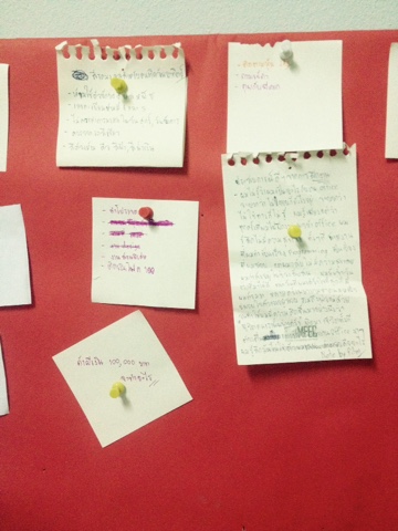 นี่คือกระดาษบางส่วนที่ผมจดๆและจดและปักหมุดไว้ เวลาที่เดินผ่านไปผ่านมาผมก็จะเห็นกระดาษพวกนี้อยู่เป็นประจำ พอเราอ่านก็จะทำให้เรานึกถึงความรู้สึกครั้งแรกที่เรานั่งเขียนมันได้ และนึกขึ้นมาได้ด้วยว่าทำไมเราถึงต้องเขียนมัน