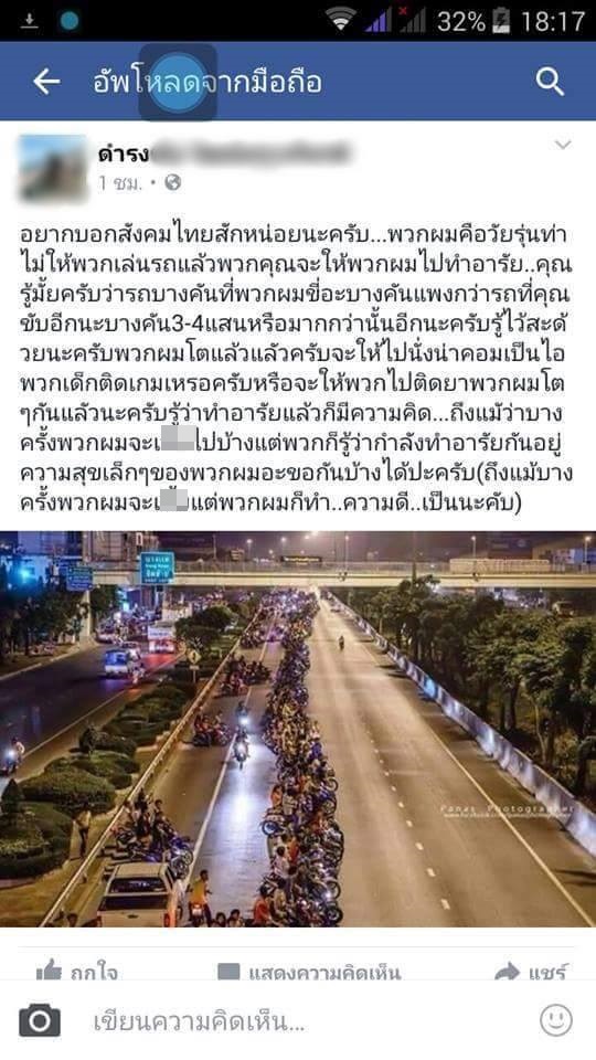 ผู้สื่อช่าวรายงานว่ามีผู้มาแสดงความคิดเห็นจำนวนมากเชิงต่อว่าผู้ที่โพสต์ขอความดังกล่าว และส่วนใหญ่เห็นว่าหากจะมีการขี่รถจักรยานยนต์ก็ไม่ควรสร้างความเดือดร้อนให้กับคนที่ใช้รถใช้ถนน นอกจากนี้ยังมีผู้โพสต์ด้วยว่าภาพดังกล่าวน่าจะอยู่แถวบริเวณถนนศรีนครินทร์