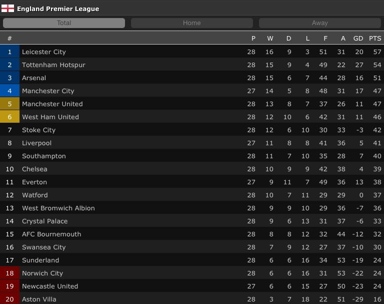 ตารางอันดับโดยรวม ณ 30 ธ.ค. 58 แต่ถ้าจัดแบ่งเป็นแบบเหย้า-เยือน จ่าฝูงแบบเหย้าจะกลายเป็นเรือใบ สองปืน สามไก่ สี่จิ้งจอก และถ้าเป็นแบบเยือน จ่าฝูงคือจิ้งจอก สองปืน สามพาเลซ สี่ไก่ -ถ้าจัดแบบทีมที่ชนะใ