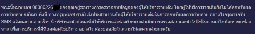 ส่งเรื่องตั้งแต่วันที่ 24 กพ.ครับ ย้ายเนื่องจากช่วงครึ่งปีที่ผ่านมาสัญญาณที่บ้านแย่ลงมาก ชั้นล่างชั้นลอยคุยไม่ได้เลย จะเป็นเสียงต่างดาวอึ๊กอ๊ากๆ ต้องเดินขึ้นไปอย่างน้อยชั้น2 หรือเดินออกหน้าบ้านเลย เคยแจ้งให้ ais ตรวจสอบไปสองรอบแล้ว ปิดงานไปแต่สัญญาณแย่เหมือนเดิม (แต่ก่อนที่บ้าน AIS ดีสุด) ตอนนี้ค่ายอื่นคลื่นเต็ม แต่ ais ถ้าอยู่ข้างล่างวางโทรศัพท์ไว้บางทีสัญญาณหายจนโทรเข้าไม่ได้เลย คุณพ่อต้องเดินขึ้นข้างบนสองชั้นหรือเดินออกนอกบ้านตลอดถ้าจะโทรออกหรือรับสาย เป็นมานานมากแล้วแก้ไม่หาย วันพุธที่แล้วเลยพาไปย้ายค่าย ซึ่งจนถึงวันนี้นานเกินเวลาที่ควรจะย้ายได้แล้ว เลยตรวจสอบไปปลายทาง ได้รับแจ้งดังนี้ ซึ่งตอนเบอร์ผมจะย้ายออกรอบที่แล้วก็เจอปัญหาการอ้างนู้นนี่จากทางais ไม่ปล่อยง่ายๆ ถ้าคุณแก้ปัญหาเรื่องคลื่นไม่ได้ ซึ่งให้โอกาสมานานแล้ว ควรปล่อยให้ลูกค้าย้ายไปเถอะครับ คนแก่จะได้ไม่ต้องเดินขึ้นลงบันไดบ่อยๆเวลาจะรับสายหรือโทรออก เบอร์ผมยังติดเงื่อนไขซื้อเครื่องถ้าหมดเงื่อนไขแล้วสัญญาณยังเป็นแบบนี้ ก็คงไม่อยู่ค่ายนี้แล้วเหมือนกัน อยู่ข้างล่างไม่มีสัญญาณโทรศัพท์และเนต ส่งข้อความไม่ไป บ่อยๆ