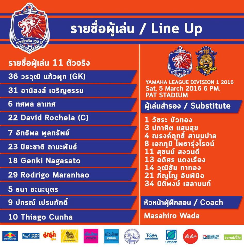 เชียงรายพิธีวัฒ ไม่มีชื่อบาดเจ็บหรือเปล่า ส่วนเอกนิษฐ์ สำรอง ส่วนการท่าเรือ พักวรวุท ส่งอดิศรลงแทน โบลี่สตาร์ทสำรองเหมือนเดิม ชัปปุยส์ วันนี้ลงสงสัยเน้นบอลโยนเปลี่ยนแกนเร็ว