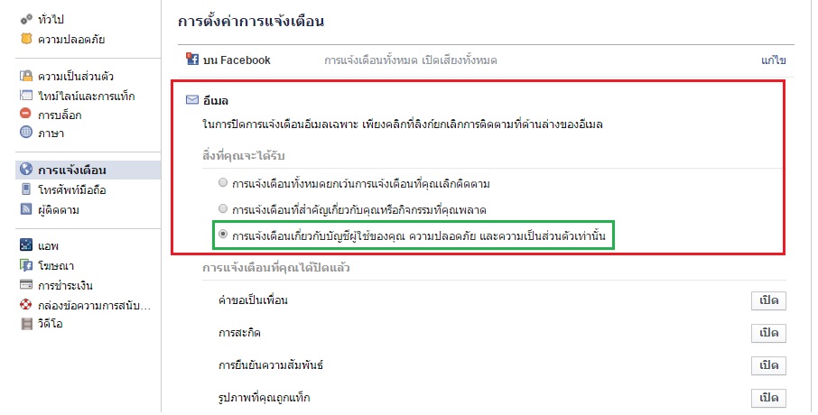 การแจ้งเตือนอีเมล ให้เลือก "การแจ้งเตือนเกี่ยวกับบัญชีผู้ใช้ของคุณ ความปลอดภัย และความเป็นส่วนตัวเท่านั้น"