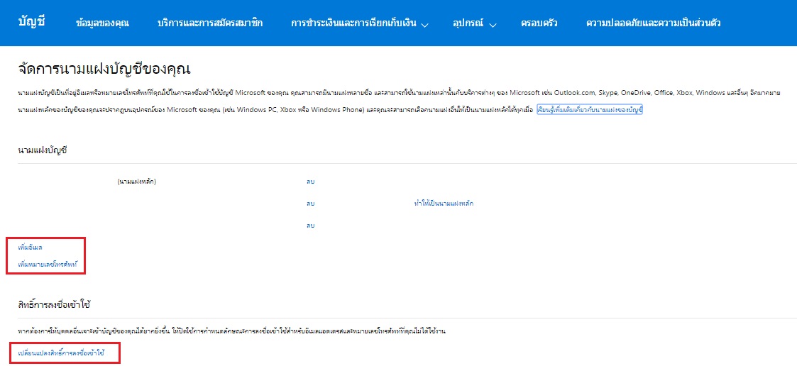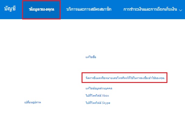 เลือก "จัดการอีเมลหรือหมายเลขโทรศัพท์ที่ใช้ในการลงชื่อเข้าใช้ของคุณ"