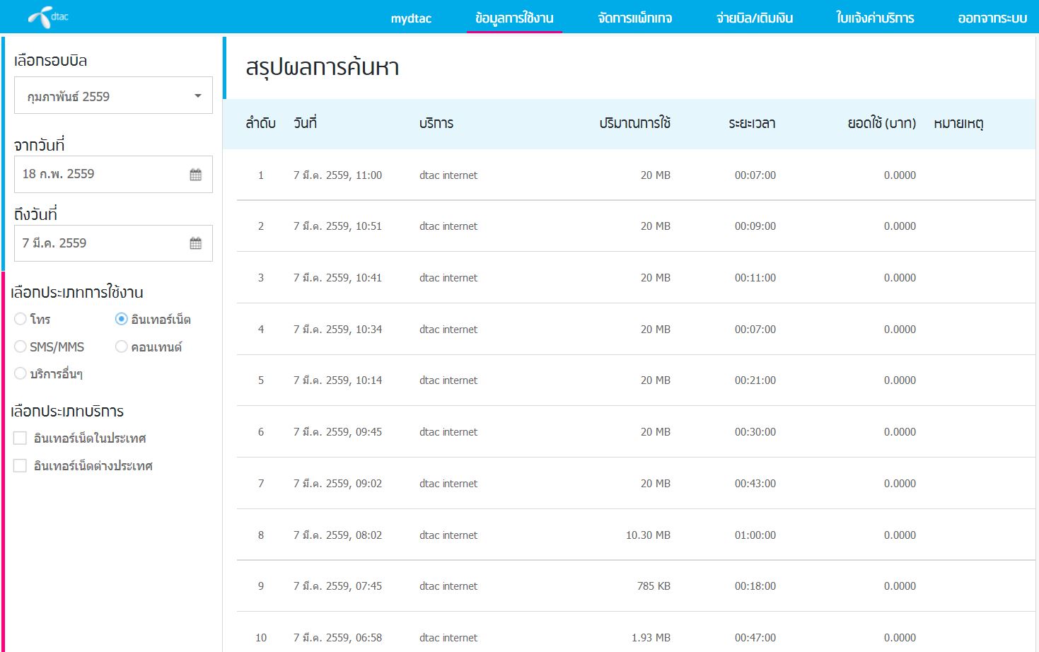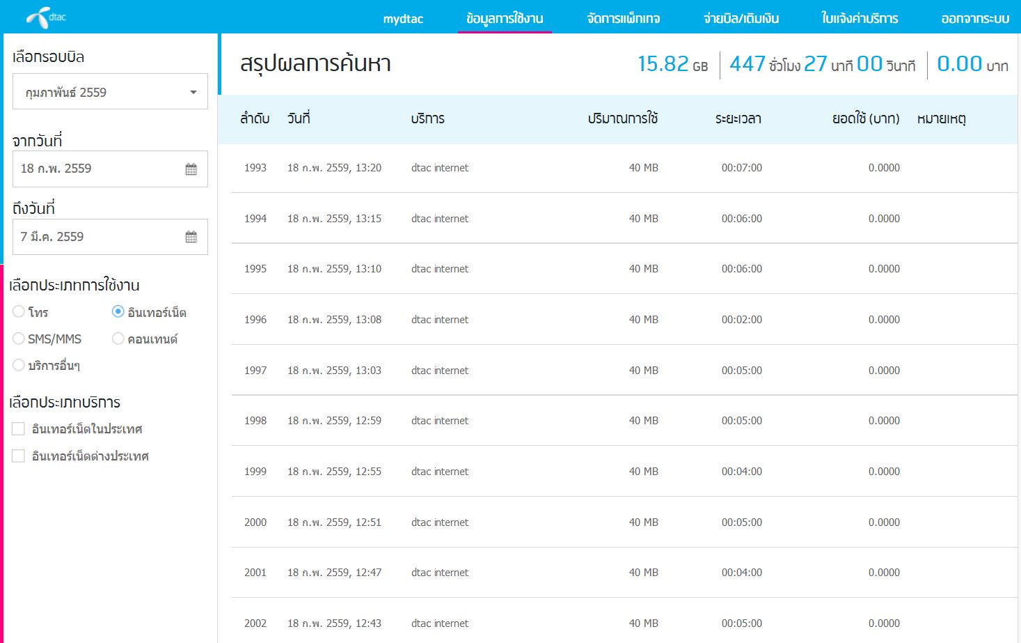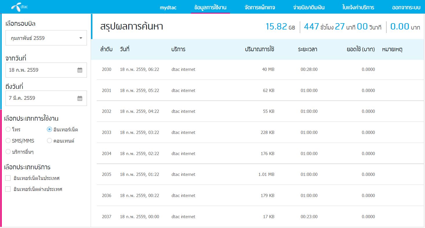 พอเข้าไปเช็คในระบบพบว่า มีการคิดปริมาณการใช้งานแบบแปลกๆ มีทั้ง 10MB , 20MB, 40MB รัวๆเป็นร้อยๆรายการเลยค่ะ ทุกๆ 2-3 นาทีคิดก็มี