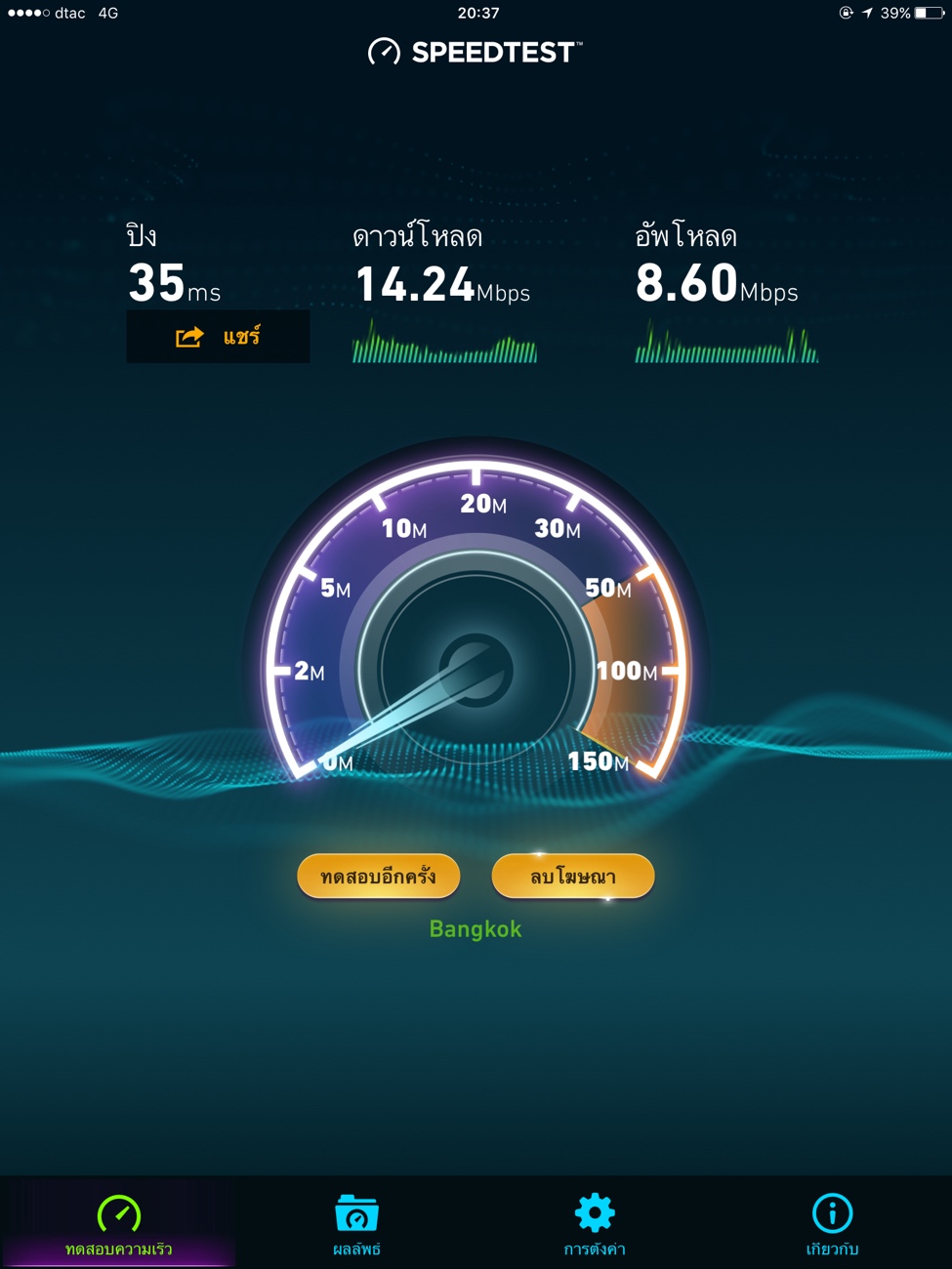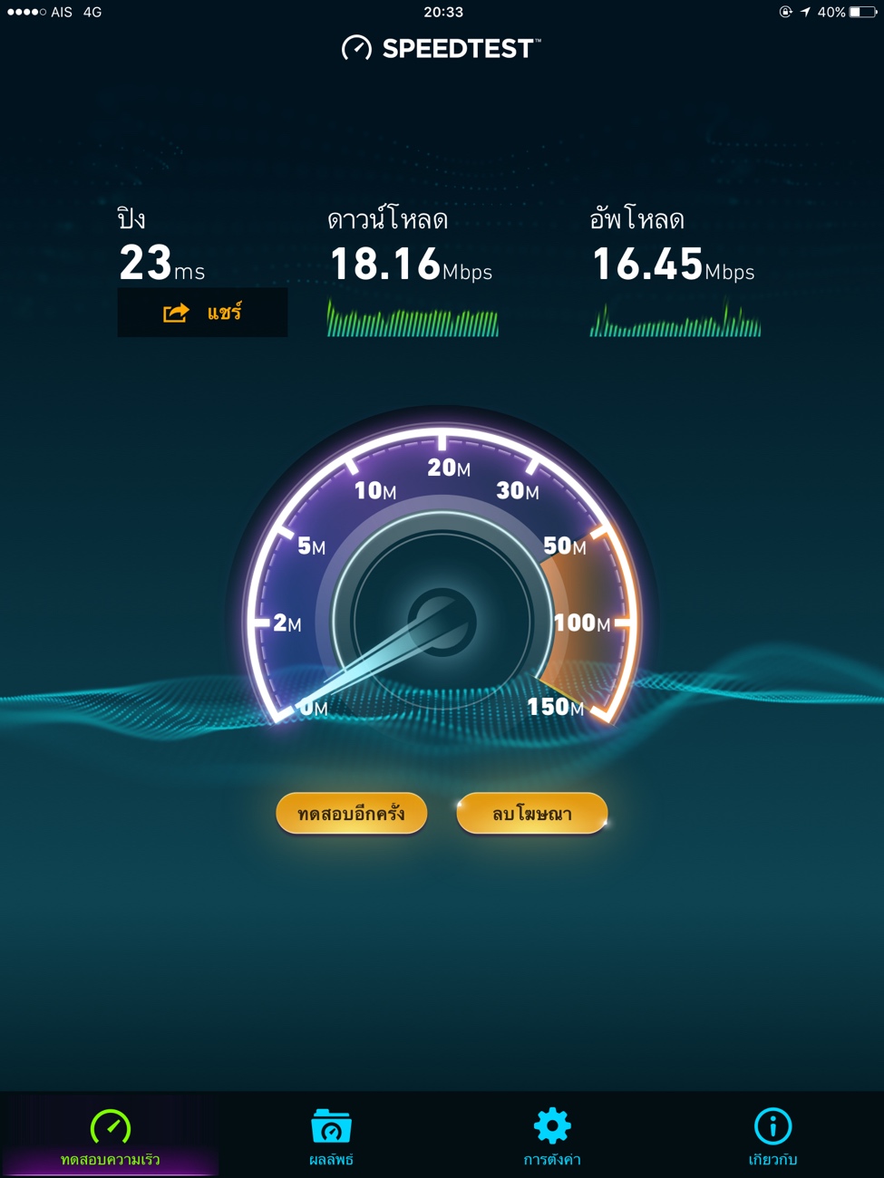 ตั้งแต่ใช้งานมาผมยังไม่เคยเทสได้เกิน 20 mb เลยทั้งสองเจ้า ไม่รู้เค้าไปเทสกันแถวไหนครับ อันนี้ของ ais ครับผมว่าดีสุดแล้วในพื้นที่ที่ผมใช้อยู่ ส่วนอันนี้ของ true h ก็ถือว่าอยู่ในระดับใช้ได้ครับ แต่ติ