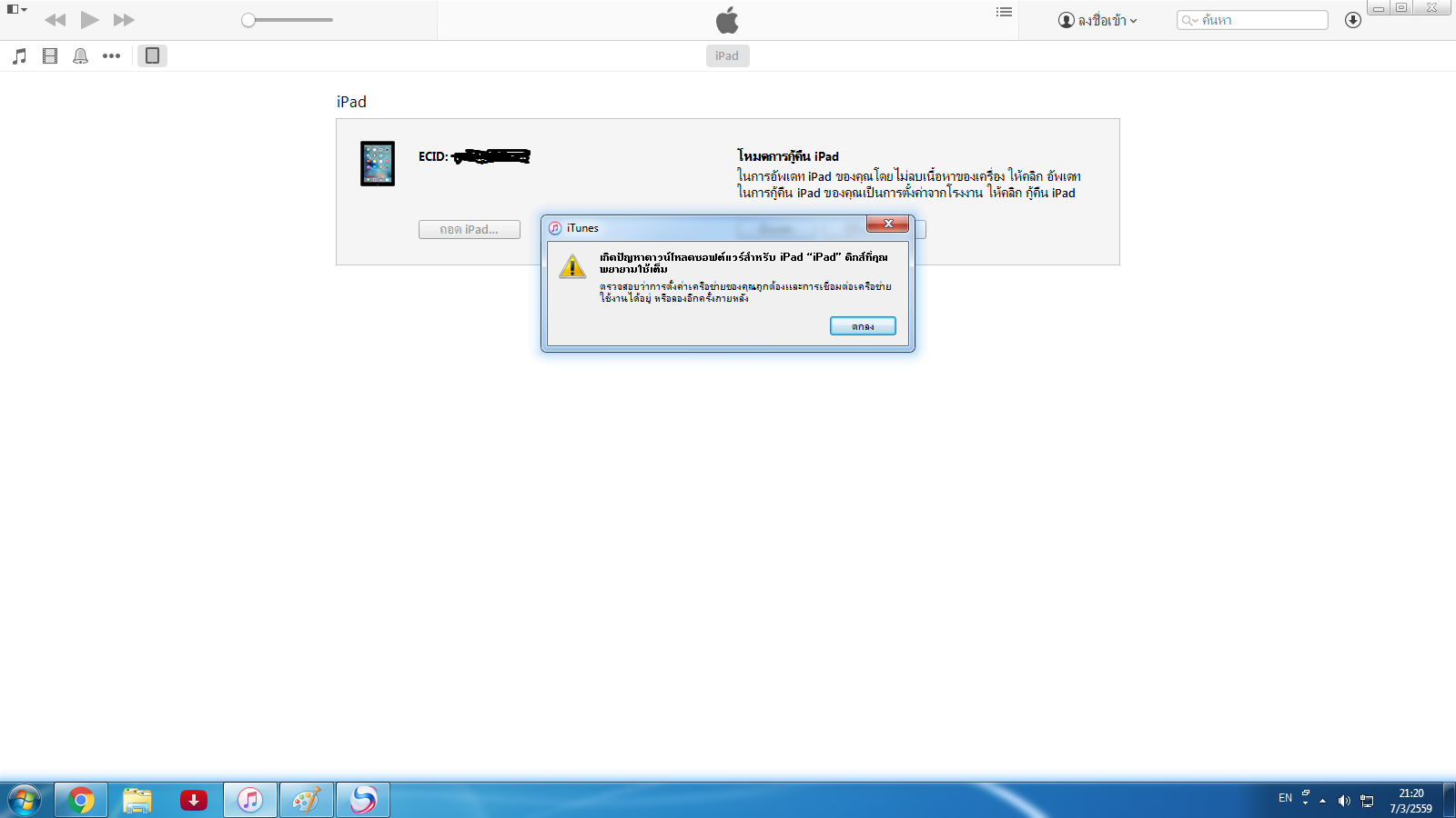 เลยลองกดนาน30วินาทีมันขึ้นให้ต่อเข้ากับ iTunes พอจะกดอัพเดตมันขึ้นว่าเนื้อที่เต็มไม่สามารถอัพเดทได้ พอกดเเบคอักก็บอกเนื้อที่เต็ม