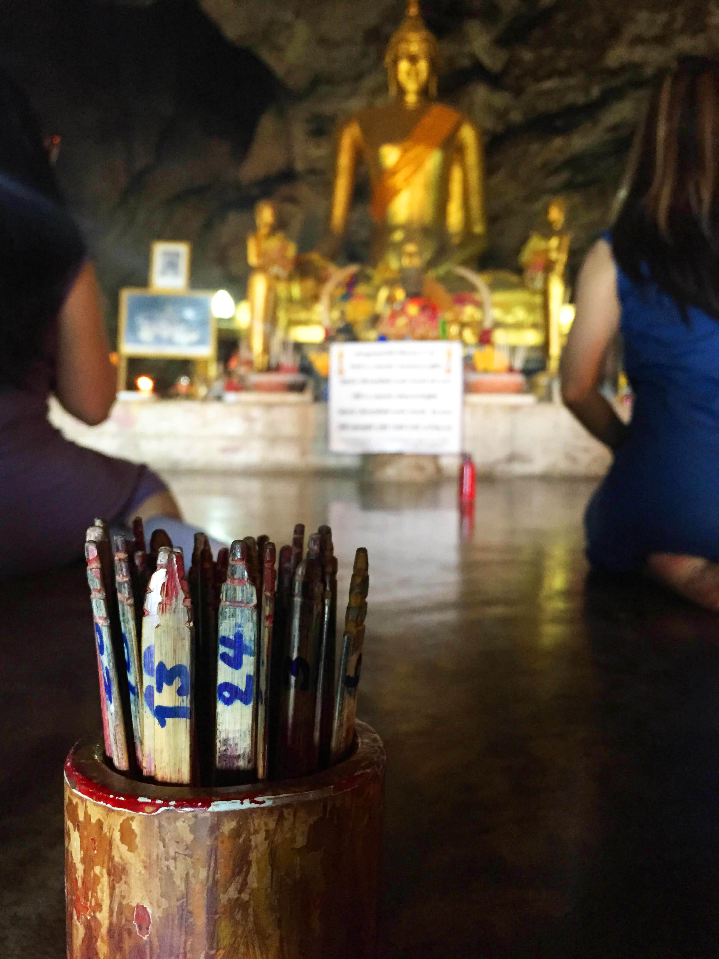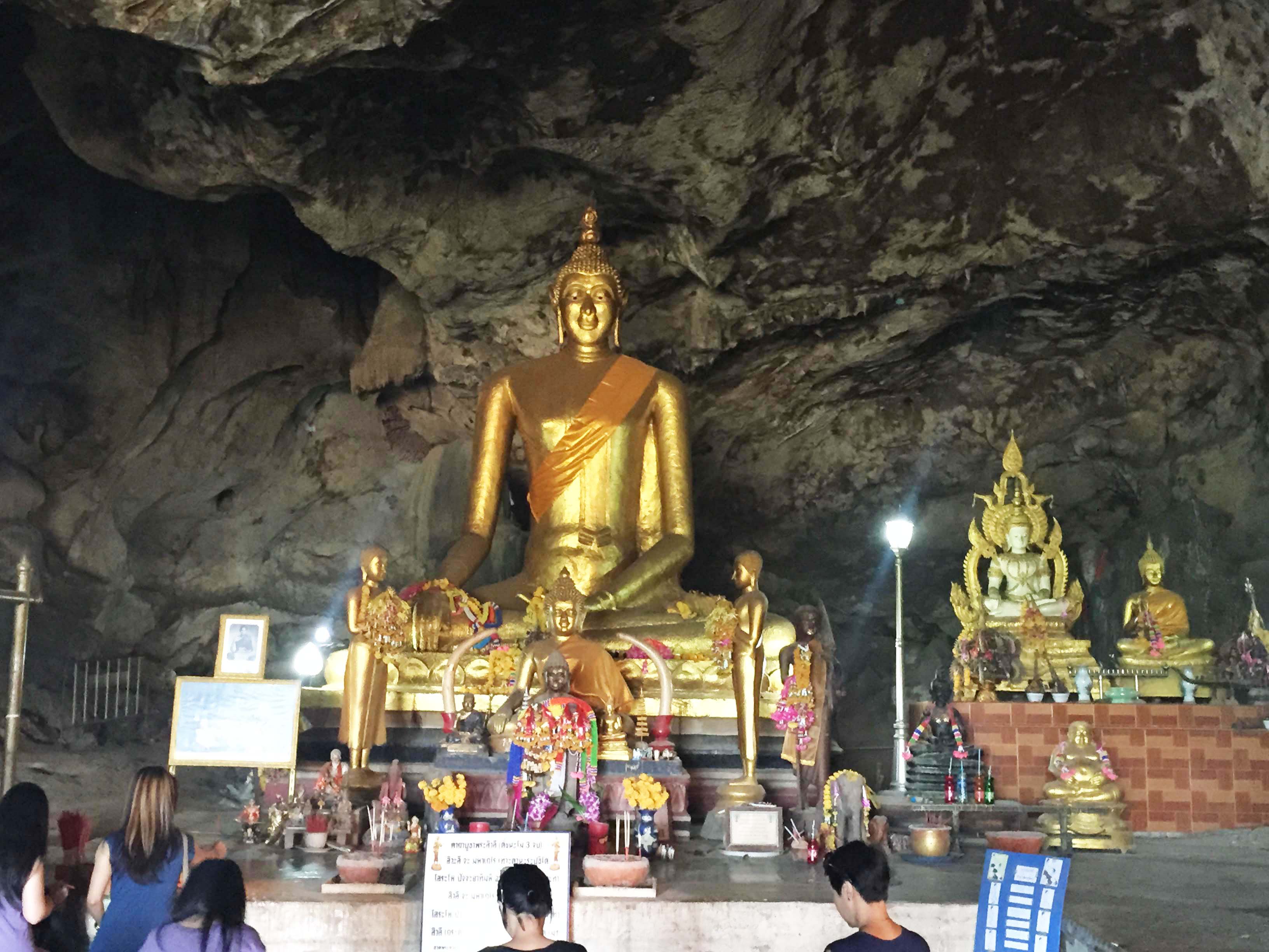 ในถ้ำก็ไม่มีอะไรมาก มีแค่พระพุทธรูป แล้วก็มีลานให้นั่งไหว้พระ ที่ขาดไม่ได้เลยคือ กระบอกเซียมซี 555 เราก็จัดการเขย่าซะลั่นถ้ำเลย (ก็ว่าเขย่าเบาๆแล้วนะ) พอถ่ายรูปกันจนหมดมุมจะถ่ายเราก็ออกเดินทางต่อไปยังจุดหมายต่อไปของเรา คือ วัดถ้ำพุหว้า