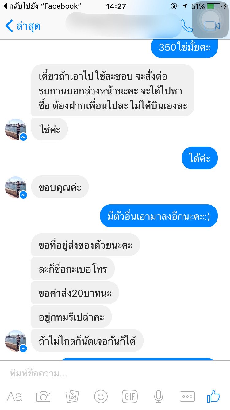 ตอนทักไปเป็นตอนเช้า 6.55คือแบบฉีกขี้ตาตื่นก็เปิดดูของจะชอปเลย5555 แม่ค้าที่เป็นแอร์สีแดงคนนี้คุยดีมาก ให้ข้อมูลครบ พูดเพราะ ตอนนั้นแระทับใจมากว่าเค้าทั้งสวยและใจดี (ส่วนใหญ่แม่ค้าที่เคยเจอตอนชอปออนไลน์จะแค่ส่งรูปพร้อมรายละเอียดละถามว่าสนใจรึปล่าวเอาก็เอาไม่เอาก็ผ่านไปไม่มีอธิบายดีแบบนี้)