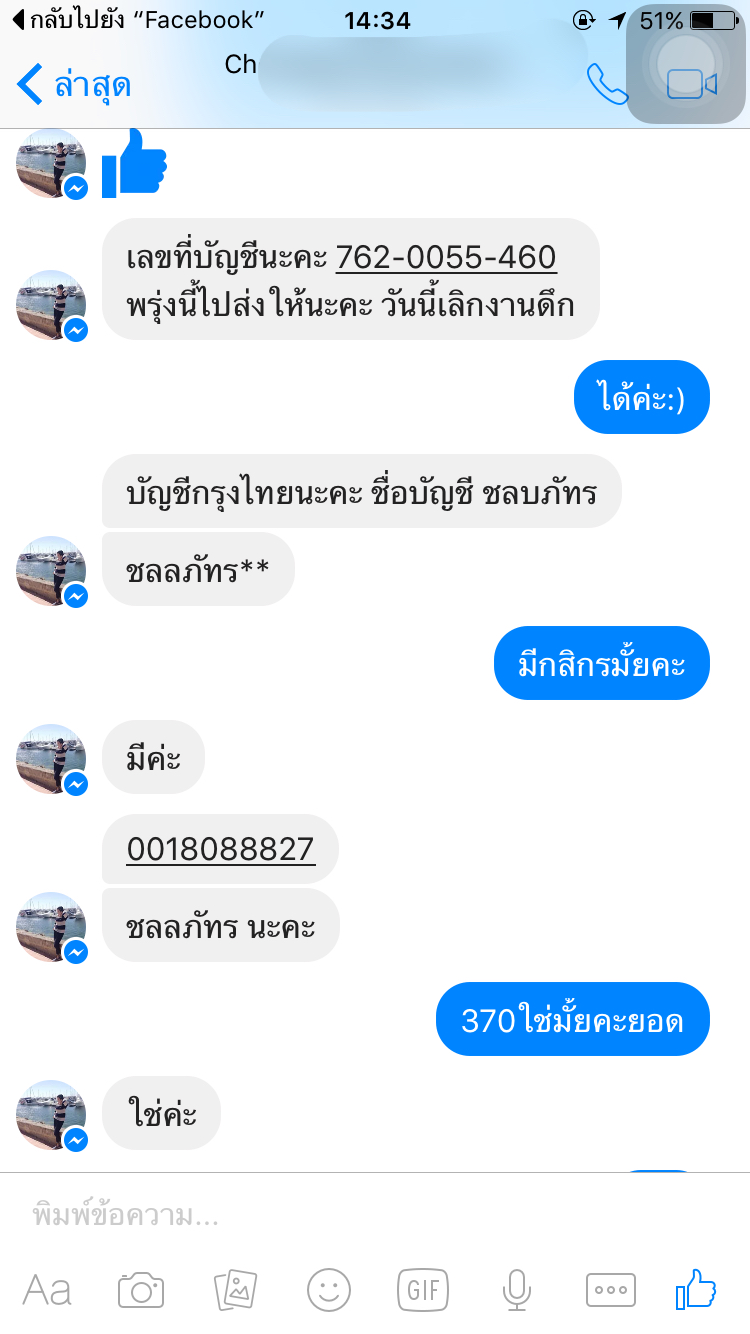 เหอะ. แต่มาคิดอีกทีหลักฐานการโอนเราก็มี แชทคุยตอนซื้อขายก็มี หน้าตาที่ทำงานนางก็รู้แล้วจะปล่อยให้นางบินไปบินมาแบบไม่มีอะไรเกิดขึ้นงั้นเหรอ? ตอนนี้ประเด็นของเรามันไม่ได้อยู่ที่เงินเท่าไหร่ แต่แม่ค้าที่มันได้เงินแล้วชิ่งเราจะปล่อยไว้ไม่ได้ เราไม่ชอบโกงใครและก็ไม่ชอบให้ใครมาโกงด้วยทุกคนก็เป็นแบบนี้ใช่มั้ยหล่ะ?