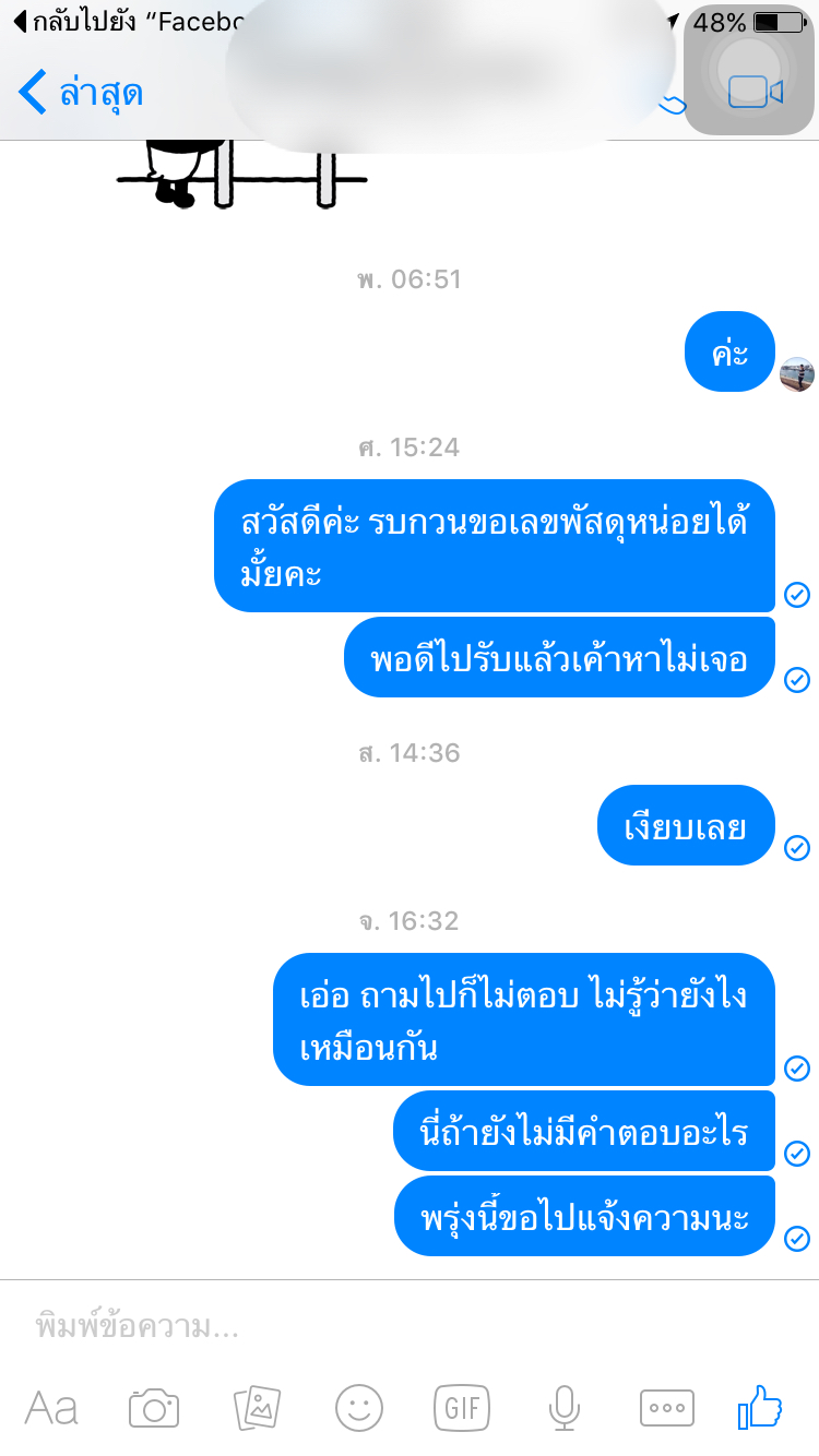 พอวันศุกร์ตอนเย็นเลยไปที่นิติคอนโดเพื่อรับการ์ดเชิญแต่งงานเพื่อนส่งมาจาก ตจวเลยเชคว่าของมาแล้วยังเค้าบอกยังไม่มีแล้วขอเลขพัสดุจะได้เช็คให้ เราเลยอินบ้อกไปหานางว่าขอเลขพัสดุหน่อยค่ะ วันนั้นนางไม่อ่านและไม่ตอบเลย เรายังโลกสวยค่าคิดว่าเค้าคงยุ่งมีไฟล์ทบินเลยรอ ตอนเช้าเปิดมาดูก็ยังไม่อ่าน ถึงตอนนี้แล้วก็ครบ 1 อาทิตย์พอดิบพอดี เลยลองอินบอกไปอีกทีแต่ก็ยังเงียบ แต่เราเห็นในแชทว่านางออนไลน์ตลอด แถมยังเปลี่ยนรูปโปรไฟล์ด้วย เลยคิดว่าคงตั้งใจเฉยแล้ว ลองแอดเพื่อนไปก็ไม่รับ ให้รุ่นพี่ที่เป็นเพื่อนนางในเฟสอินบ้อกไปก็ไม่อ่าน รุ่นพี่ยังงง