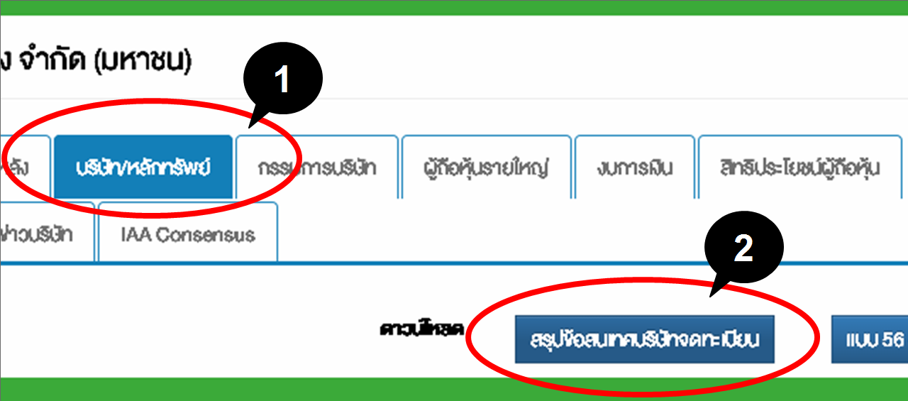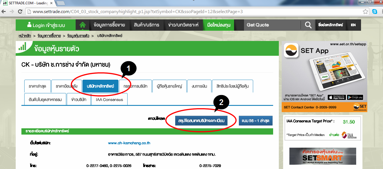 เจ้า “Fact Sheet” มันมาแอบอยู่ที่ตรงนี้นี่เอง ตรงวงกลมสีแดงหมายเลข 2 ชื่อปุ่ม “สรุปข้อสนเทศบริษัทจดทะเบียน” พอกดเข้าไปก็จะเห็นหน้าจอแสดงข้อมูล “Fact Sheet” ปรากฏขึ้นมา หน้าตาเหมือนเดิมเลย..แบบนี้ค่อยสบายใจขึ้นมาหน่อย!!