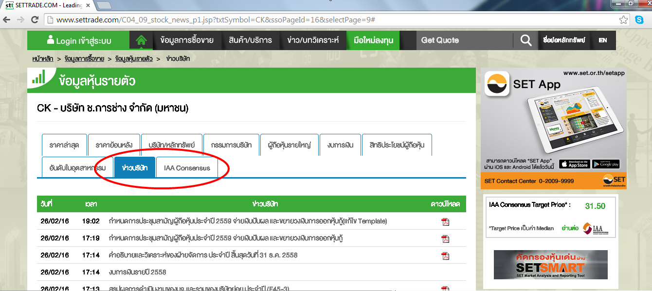 หลังจากเข้าไปที่ website www.settrade.com ก็ลองกรอกชื่อหุ้นเข้าไปตรงช่องค้นหา ตามรูปด้านบนที่ลูกศรสีแดงชี้อยู่น่ะครับ