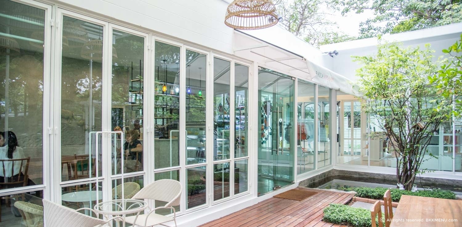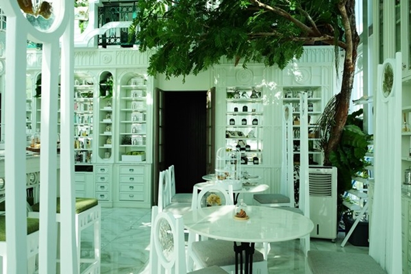 สังเกตกันได้ตั้งแต่ตัวร้านอิฐก้อนเล็กสีขาวที่ ผนึกเข้ากับหน้าต่างกระจกบานใหญ่รอบร้านที่ให้แสงธรรมชาติส่องเข้ามาเพิ่ม ความโปร่งสบาย แฝงความหรูหราด้วยเคาน์เตอร์หินอ่อนขนาดใหญ่ที่ตั้งอยู่กลางร้าน เฟอร์นิเจอร์สีขาวล้วน ดอกไม้และของกระจุกกระจิก ส่วนโซนเอาท์ดอร์ สามารถมองเห็นสวนร่มรื่นได้จากทุกโต๊ะจึงซึมซับความรื่นรมย์ได้อย่างทั่วถึง เหมาะกับจะแวะมาพักผ่อนด้วยการจิบน้ำผลไม้คั้น สด หรือชาคู่กับขนมหน้าตาสวยงาม อาทิ Peter Pandan (160 บาท) Treasure Chestnut (170 บาท) เเละ Caramel Dream (150 บาท)