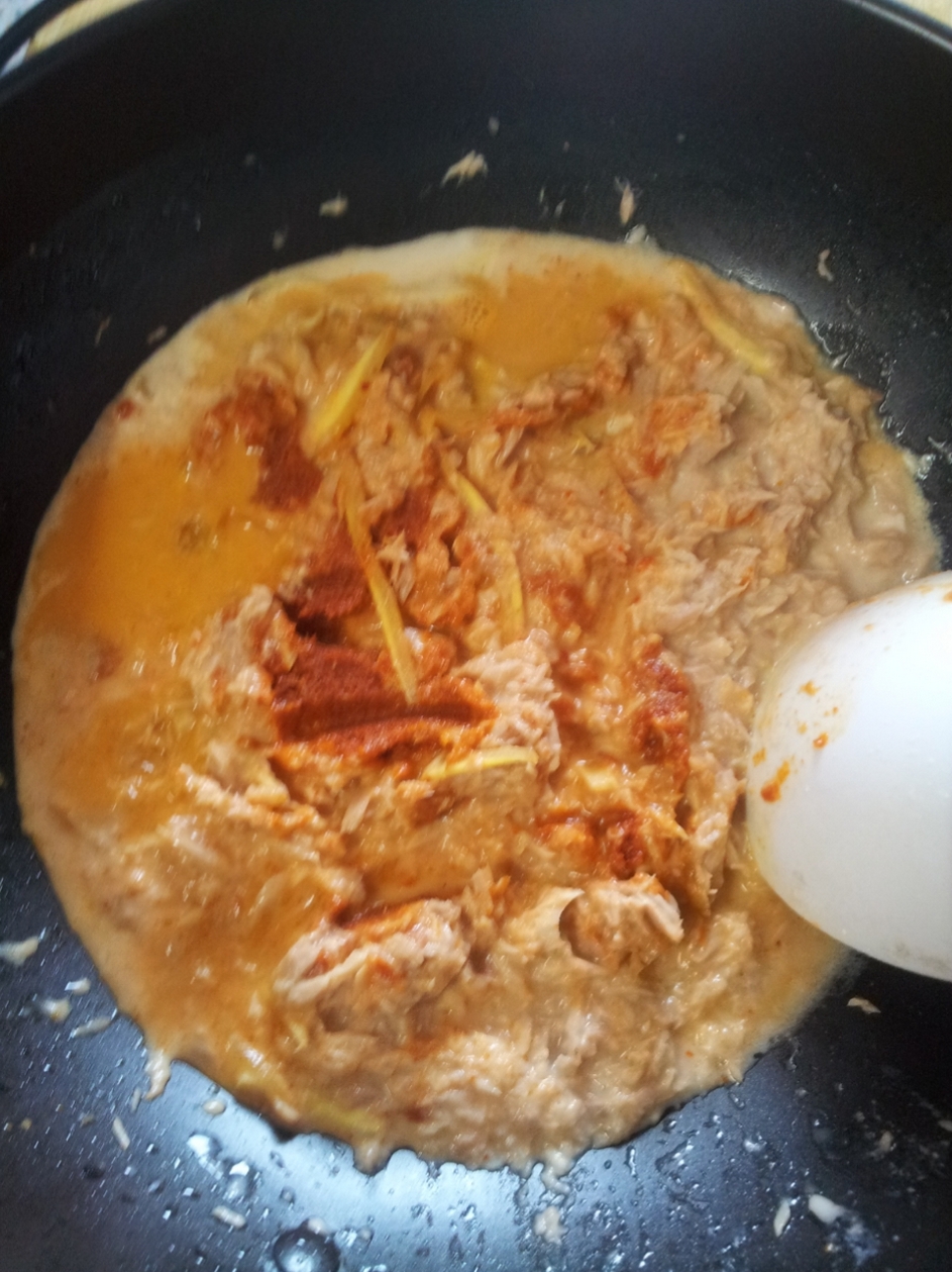 ขั้นแรกเลย เอาเนื้อปลาทูน่ามาบีบน้ำออกแล้วยีเนื้อให้ละเอียด มาผัดกับพริกแกง ( ปริมาณกะๆเอา ชอบเผ็ดมากก็ใส่เยอะหน่อย ) กระชาย และกะทิบางส่วนจนแตกมันได้ที่