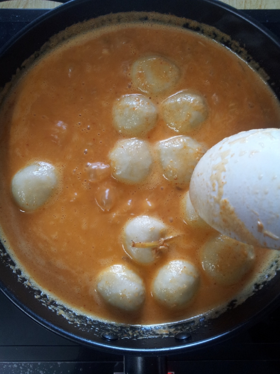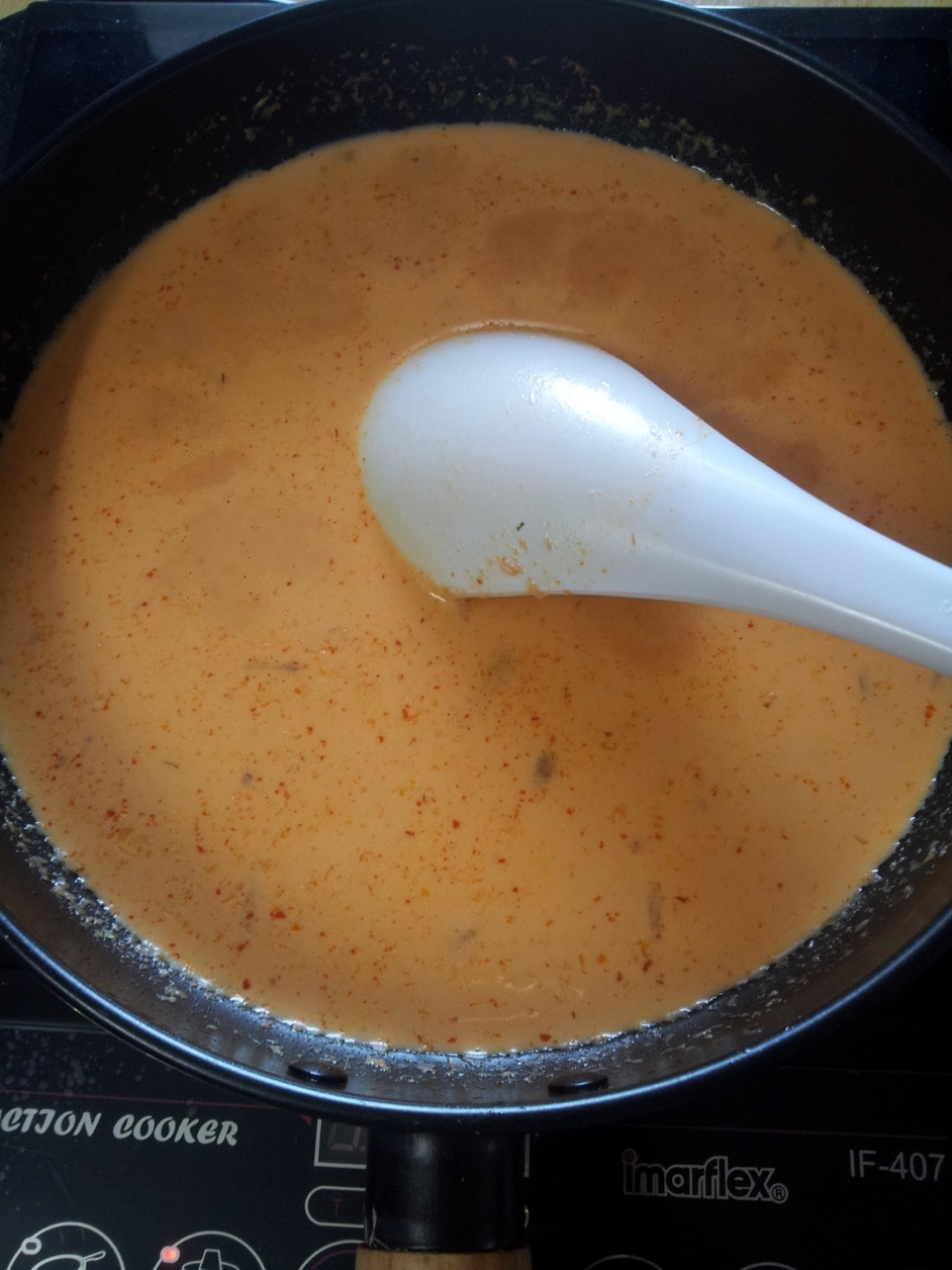หลังจากนั้นเติมน้ำที่เราใช้ต้มเนื้อไก่ ( ที่กบบอกให้เก็บน้ำไว้ก่อน ) ลงไป กับกะทิอีกส่วน เคี่ยวต่อจนไกล้เดือด ปรุงรสตามชอบ