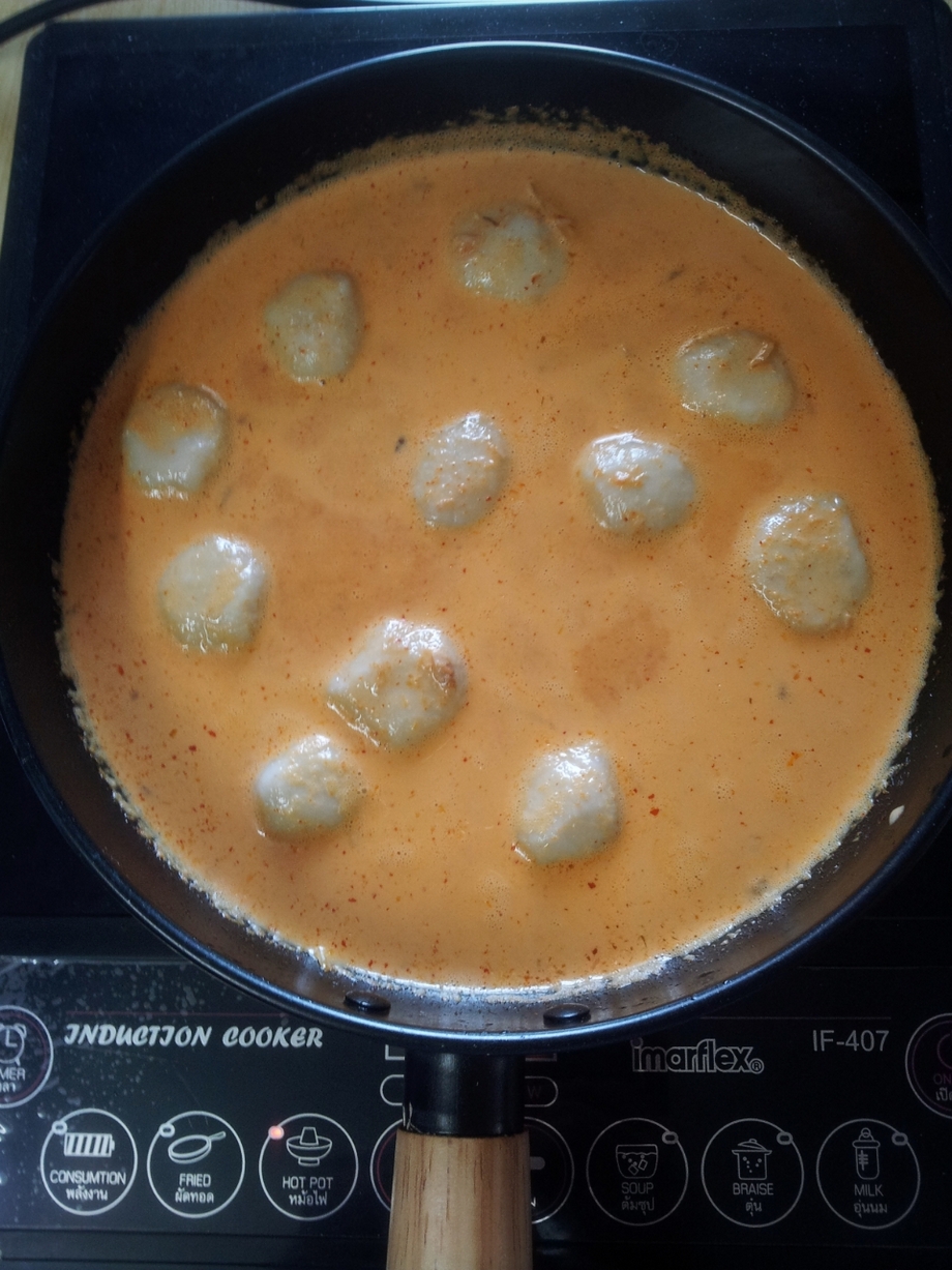กระชายซอยละเอียด พริกแกง ลูกชิ้นปลา