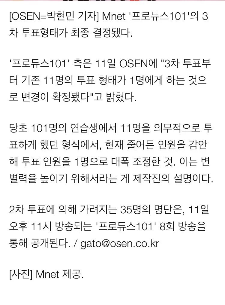 วันนี้ทางช่องMNET ได้ออกมาสนทนาเรื่องรูปแบบการลงคะแนนครั้งที่สามของ PRODUCE101 โดยตอนแรกรอบที่ 3 จะเป็นรอบโหวตเดี่ยว ซซ.1ก็เหมือนกัน แต่วันนี้MNET ลงข่าวว่าอาจจะมีการเปลี่ยนแปลง เห็นด้วยกันมั้ยคะ ? เ