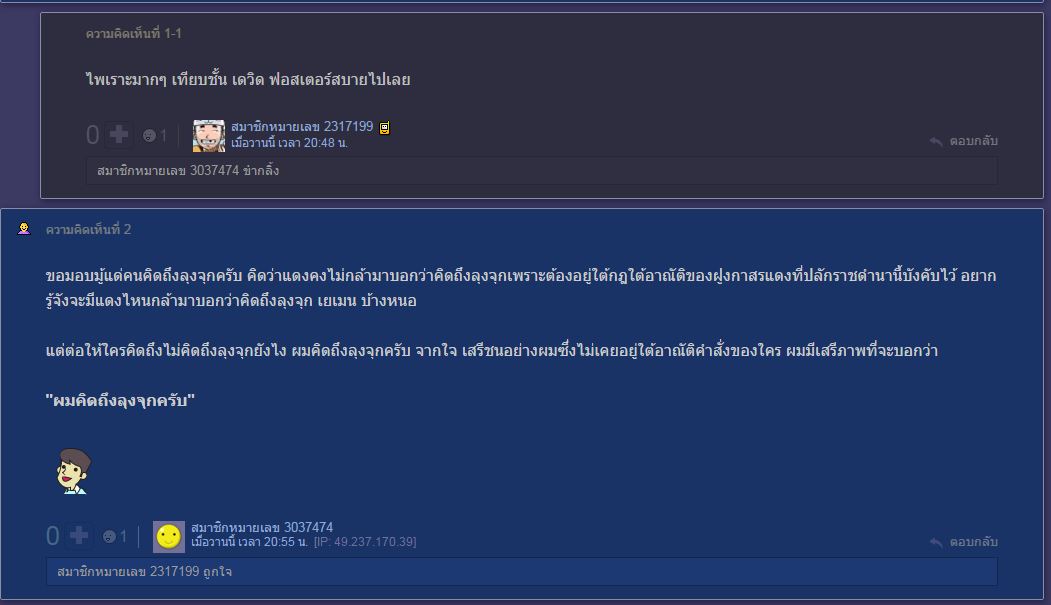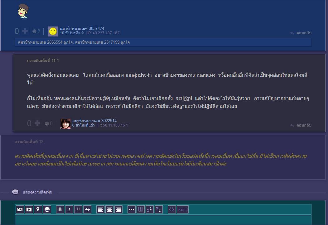 *ขออภัยที่ลืมปรับวันที่ให้เป็นเวลาปัจจุบันครับ ตอนนี้ปรับเป็นเวลาปัจจุบันแล้วขอบคุณครับที่ได้อ่าน ทั้งนี้อย่างที่ได้ชี้แจงไว้ ณ เบื้องต้นว่าต้องการให้เป็นกรณีศึกษาที่ได้อ่านอย่างปราศอคติต่อกันและที่ต้องให้เห็นทุกคอมเมนต์เพื่อให้เข้าใจต่อบริบททุกๆบริบทใดๆที่เกิดขึ้น ส่วนที่มีการพาดพิงถึงกลุ่มใดนั้น กรุณาอย่าคิดว่ามองความข้างเดียวหากทำผิดใดๆก็ต้องมีจิตสำนึกในการรับความผิดพลาดครับ ถ้าได้อ่านด้วยใจที่เปิดกว้างจะพบได้เรื่องราวถ้อยคำต่างๆตามความเป็นจริงที่เกิดขึ้นนี้ ถ้าถามว่าทำไมตั้งนานไม่ทำหรือตั้งนานพึ่งมาเรียกร้องไม่ชี้แจงก่อนหน้า มีมนุษย์คนใดที่มีความสมบูรณ์พร้อมไปทุกด้านกัน คนเราทุกๆคนย่อมมีเรื่องที่ทำได้ดีหรือทำไมได้อยู่ เรื่องราวทุกๆอย่างก่อนหน้าผมพยายามจะลืมและคิดว่าอยู่เฉยๆไปเอง แต่ในทางหนึ่งมีใครที่ตอบคำถามผมได้ไหมครับหรือไม่มีใครเลยที่สงสัยถึงมาตรฐานกฏเกณฑ์ต่างๆที่มีการตัดสินอย่างเป็นกลางโดยไร้อคติต่อกันจริงๆ สิ่งที่เกิดขึ้นนี้พวกคุณจะยอมให้มันเกิดขึ้นไปเรื่อยๆโดยไม่มีการตื่นตัวความร่วมมือร่วมแรงร่วมใจกันในการที่จะทำให้สังคมดีขึ้นกันบ้างหรือครับ อย่างที่ผมเคยบอกไปแล้วและพยายามเรียกร้องมาตลอดว่าให้มองข้อดีของกันและกันบ้าง อย่าปล่อยให้อคติทางการเมืองบดบังจิตใจส่วนที่ดีของคุณในการมองคน รู้ไหมครับมีหลายๆคนเรียกร้องให้มีการยกระดับบอร์ดแต่ไม่มีการพยายามที่จะกระทำใดๆที่จะช่วยยกระดับเลย สิ่งที่ผมทำนี้มีใครที่อยู่ในบอร์ดนี้ต้องการที่จะทำเพื่อให้บรรยากาศในการใช้พื้นที่นี้ดีขึ้นมาบ้างไหมครับ หรือว่าได้แต่พูดบ่นๆกันและค่อนขอดกันว่า ราชดำนากัน ถ้าคุณไม่เริ่มลงมือทำแล้วเมื่อไรสังคมจะดีขึ้นมาได้ล่ะครับ คนๆเดียวทำทุกอย่างไม่ได้หมดหรอกนะครับ ก็เหมือนกับประเทศที่ถ้าพวกคุณขาดความสามัคคีในการทำสิ่งต่างๆเพื่อประเทศและเอาแต่ทะเลาะเบาะแว้งแบ่งฝักแบ่งฝ่ายแทนที่จะหันมาร่วมมือกันทำเพื่อประเทศจริงๆแล้วต่อให้ใครจะเป็นรัฐบาลขึ้นมาประเทศก็ไม่เจริญก้าวหน้าไป ลองไปดูการ์ตูนการเมืองที่นักเขียนพม่ามองประเทศของเรา และลองเทียบความเจริญรุดหน้าของประเทศเพื่อนบ้านเราดูว่าเค้าไปถึงไหนแล้ว และเราตอนนี้ดีหรือแย่กว่าเค้ากันแล้วลองคิดดูดีๆนะครับว่าประเทศเสียโอกาสไปนานขนาดไหนแล้วจากความขัดแย้งรุนแรงต่างๆของสังคมไทยกัน เรื่องการอาศัยพื้นที่บ้านคนอื่นเช่นกันถ้าคนเอาแต่อาศัยและไม่ช่วยดูแลกันบ้านก็เละ